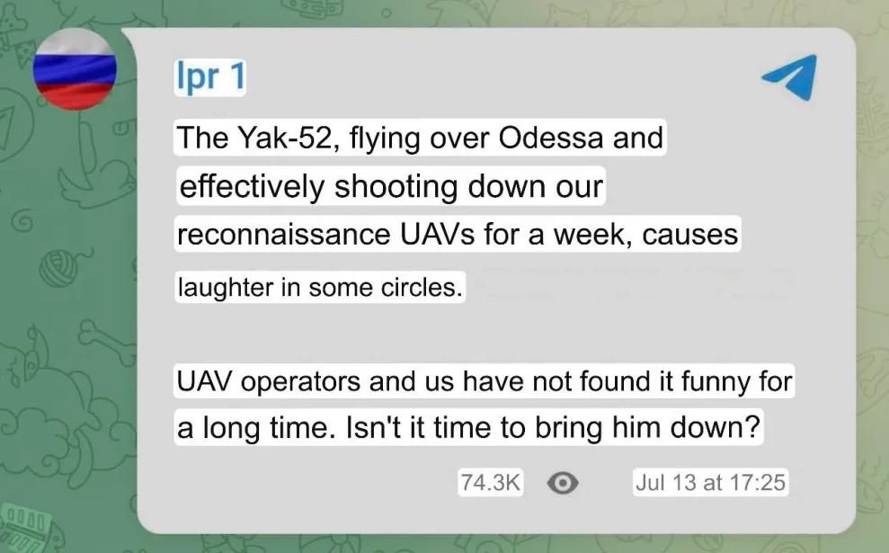 Ruští dronaři kritizovali posměšky, které někteří ruští blogeři pronášeli na adresu ukrajinského sportovního letadla, které loví drony tak, že je sestřeluje ručními zbraněmi rovnou z kabiny – skoro jako za první světové války. Letadlo je totiž podle dronařů velmi efektivní a má na kontě už několik sestřelů drahých ruských průzkumných dronů, zatímco Rusové nemají prostředky jak jej sestřelit.