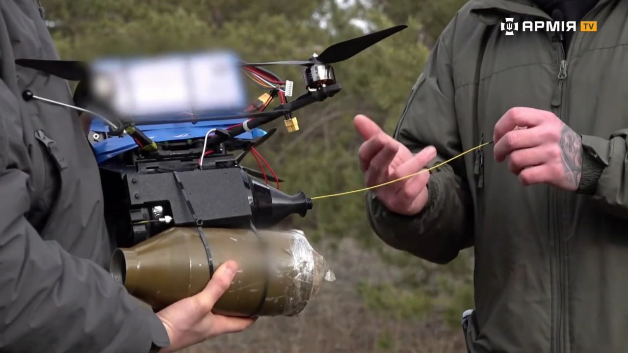 Ukrajinský optický FPV dron s podvěšeným hlavním nábojem z tandemového kumulativního granátu PG-7VR z RPG-7.