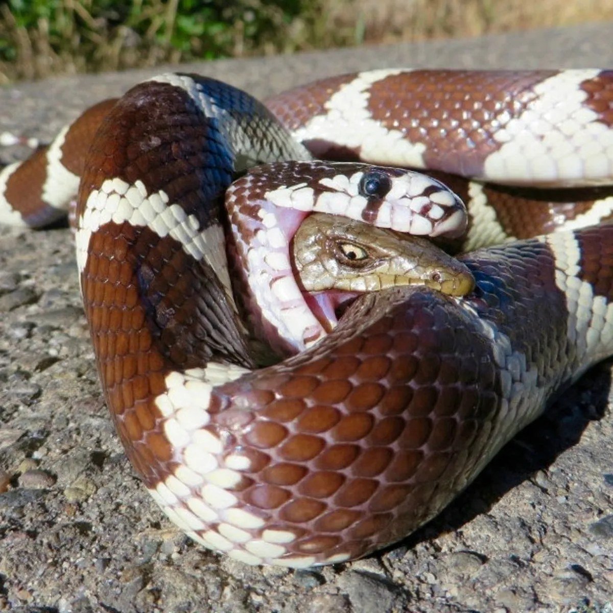 Britský veterinář na klinice v Sussexu musel v roce 2009 řešit poněkud neobvyklý případ. Zákazník mu přinesl do ordinace hada zakousnutého do vlastního ocasu. Reggie si spletl svůj ocas s jiným hadem a zakousl se sám do sebe. Možná si menší problém i uvědomil, ale v tom, aby se zase pustil, mu bránily jeho zadní zuby. Jeho majitel si všiml, že se had začíná dusit. Spěchal s ním proto na kliniku, kde mu tamější odborník na exotická zvířata Bob Reynolds otevřel tlamu, vykloubil čelist a odstranil ocas, předtím, než mohl být natráven. "Když had jako je tento, žije na malém prostoru, stane se, že si sám sebe splete s jiným plazem," vysvětluje veterinář.