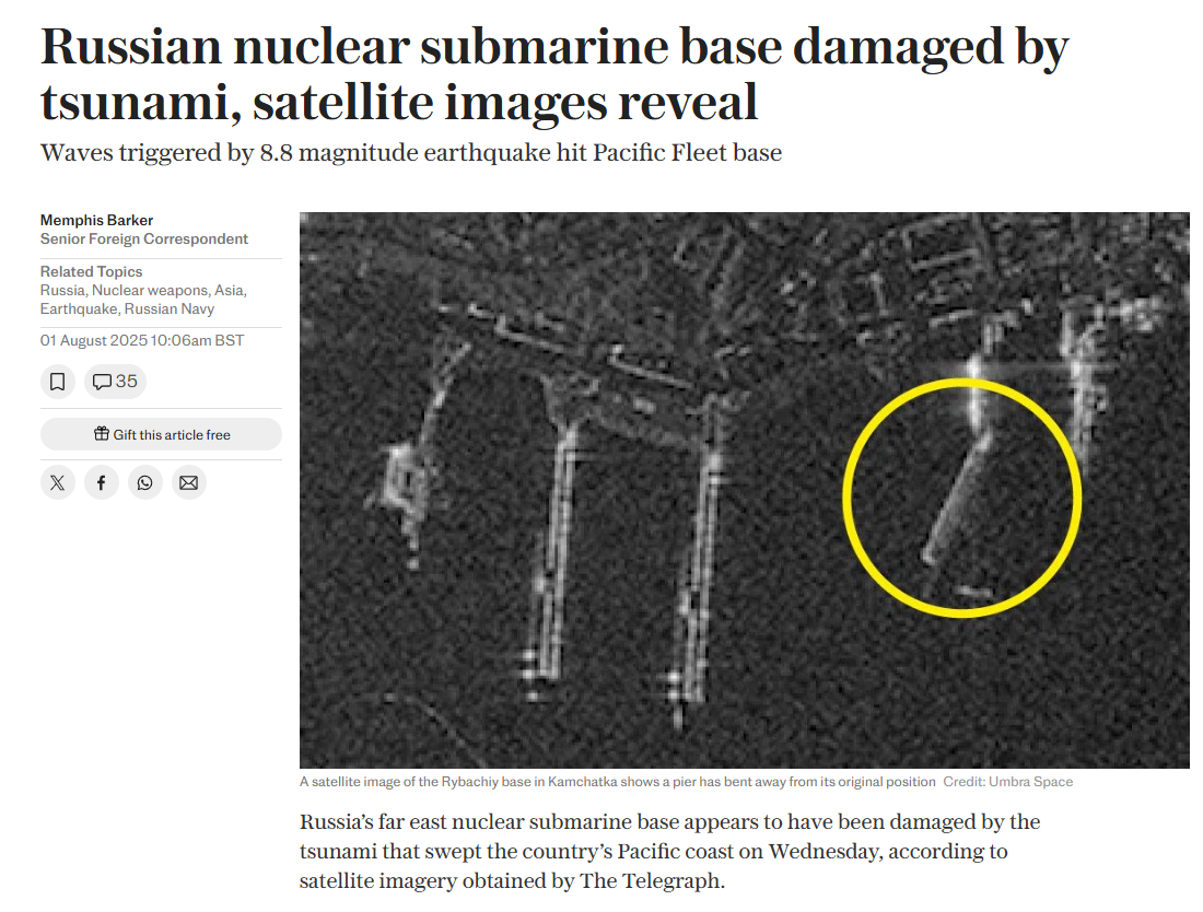 Podle deníku The Telegraph poškodila vlna tsunami na Kamčatce molo na ruské základně jaderných ponorek Rybačij, kde je umístěna velká část ponorek Tichomořské flotily. Jedna část mola byla posunuta z původní polohy. Zatím není jasné, zda tsunami způsobila další škody na základně po otřesech z nedávného zemětřesení.