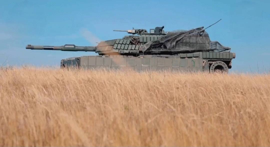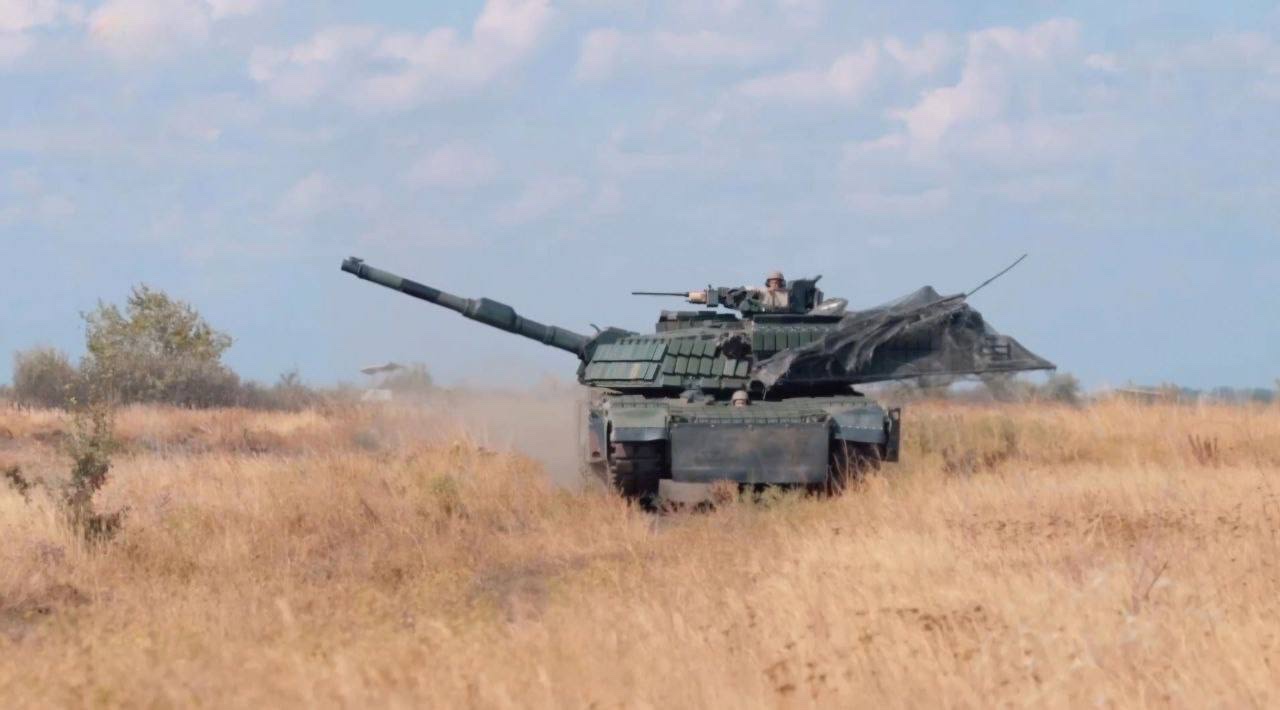 Vyladěný tank Stridsvagn 122, založený na tanku Leopard 2A5, ozbrojených sil Ukrajiny.
