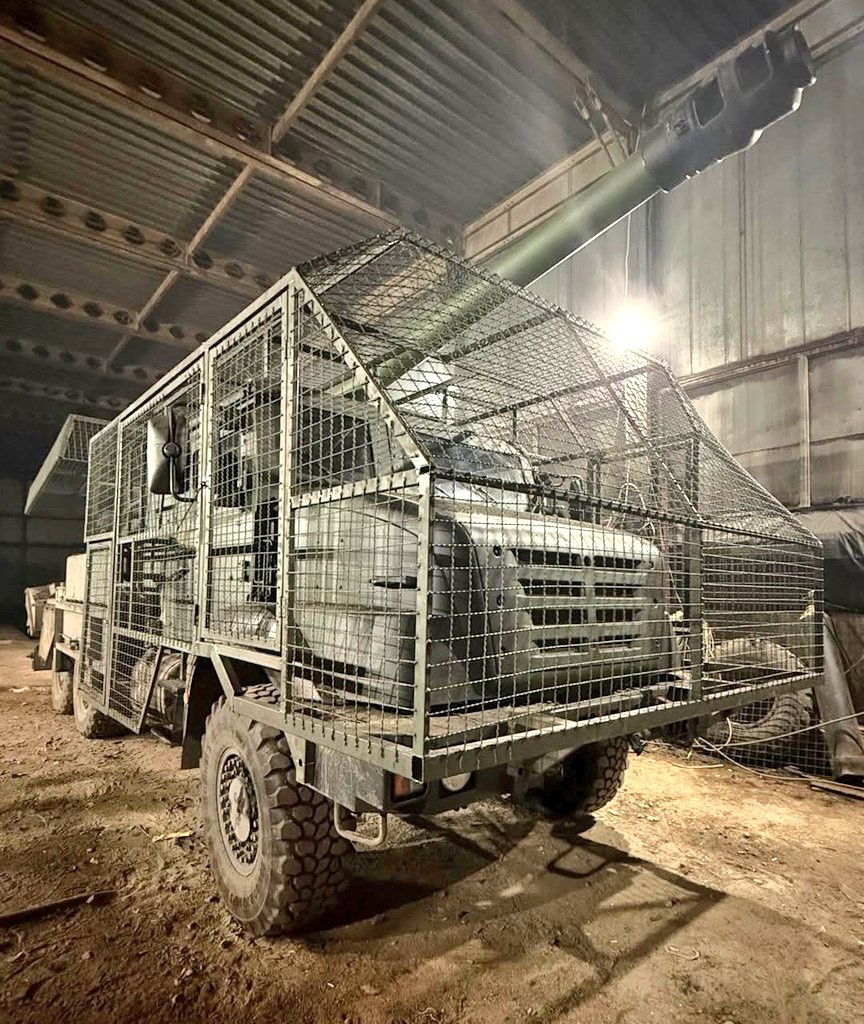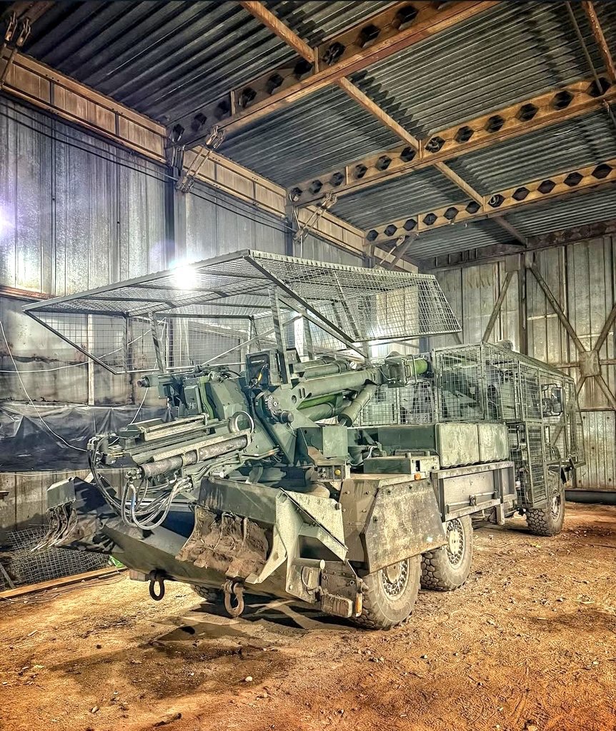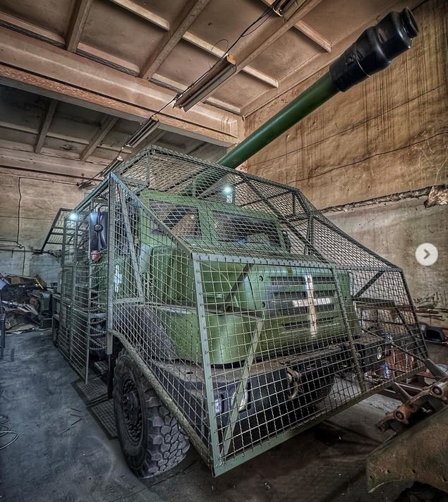 Další samohybná houfnice CAESAR ukrajinských ozbrojených sil vybavená dodatečným ochranným pancéřováním z mříží proti dronům.