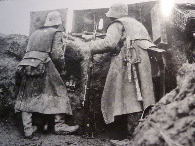 Nejde o nákrčník, ale o zesílení pro standardní helmu. pod bradou si ho uvázal za normální otvory kterými se uchycuje to zesílení na helmu, k tomu má helma ty "špunty". Helma je pak poměrně těžká proto se to řešilo tím, že se dalo zesílení sundat a použilo se (třeba pro kulometníky) ve chvíli kdy byli na pozici. Bodák je myslím zcela běžná pro pušku 81871/84, který byl standardní i pro pušky 1888. Tyto starší pušky se za WW I běžně používaly (ty 1888) takže ani zde bych neviděl až tak velkou raritu. Vlevo vedle ručního granátu je signální pistole zřejmě model 1894