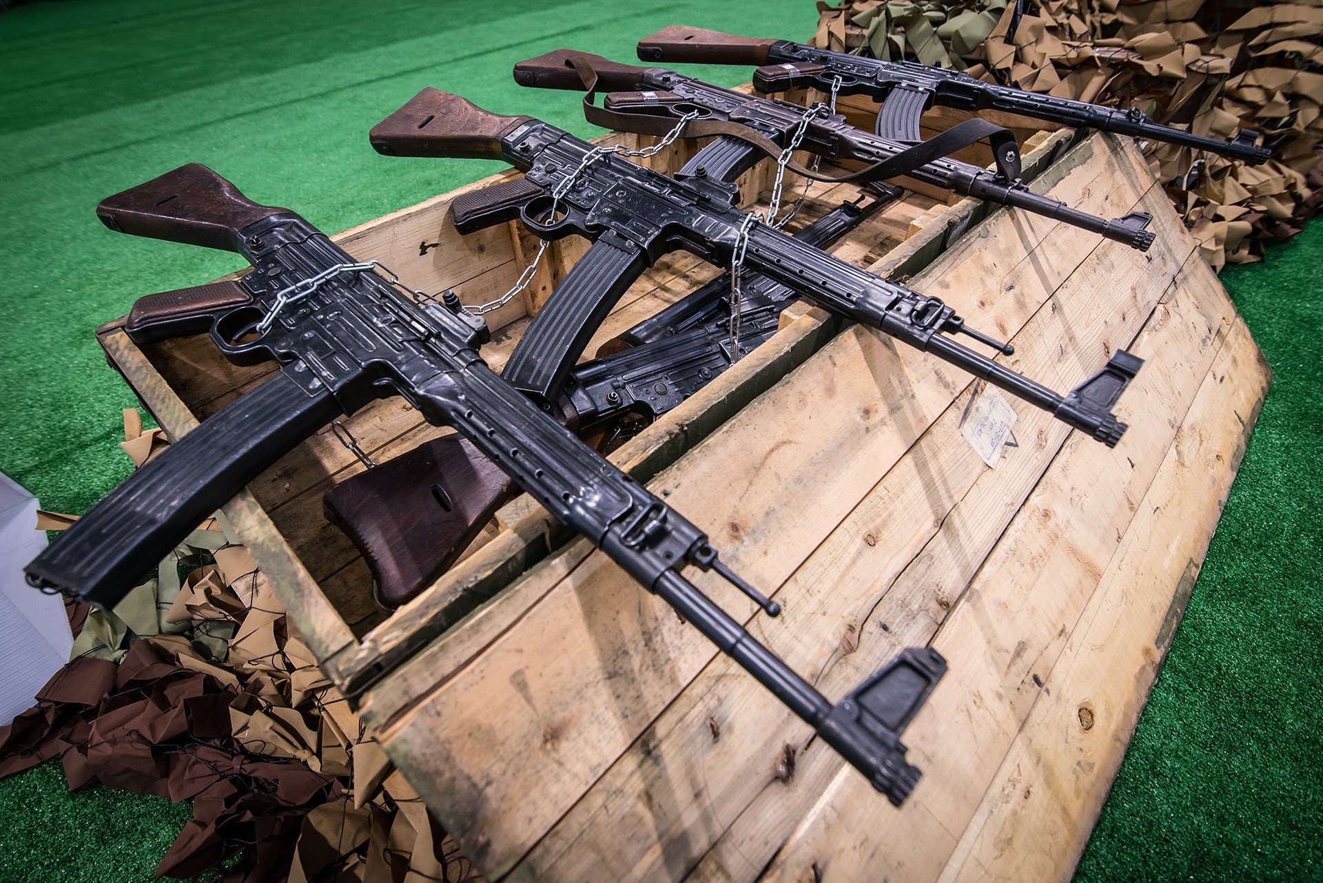 Německá útočná puška StG 44 (značí rok výroby) na iráckém černém trhu, v prosinci 2025. Samotná zbraň byla dovezena ze Sýrie, kam bylo po druhé světové válce vyvezeno velké množství různých kořistních zbraní ze všech koutů Evropy. Především z Francie. Kuriozita jsou hlavně ty náboje 7,92 × 33mm Kurz. Po válce se toto střelivo vyrábělo v NDR, Československu a Egyptě. V menší míře probíhá produkce dodnes.