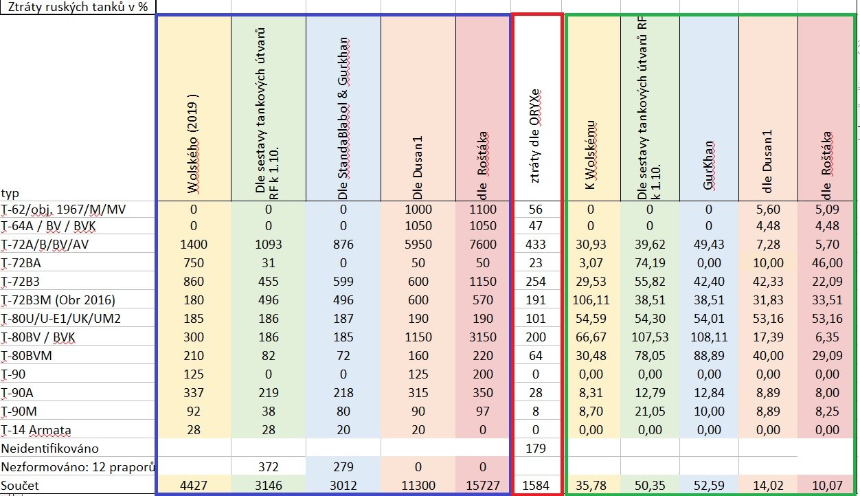 V modrém rámečku jsou početní stavy tanků vojsk RF dle jednotlivých zdrojů. V červeném jejich ztráty dle Oryxe očištěné o duplikační záznamy. A v zeleném jsou potom poměrné ztráty vždy k danému zdroji početních stavů.