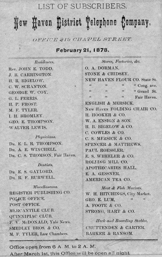 Začátkem roku 1878 byl vydán první telefonní seznam. Měl pouze jednu stránku, která obsahovala 50 jmen telefonních abonentů v New Haven USA a byl zajímavý i tím, že neobsahoval žádná telefonní čísla či adresy. Spojovatelka jednoduše znala všechny jménem