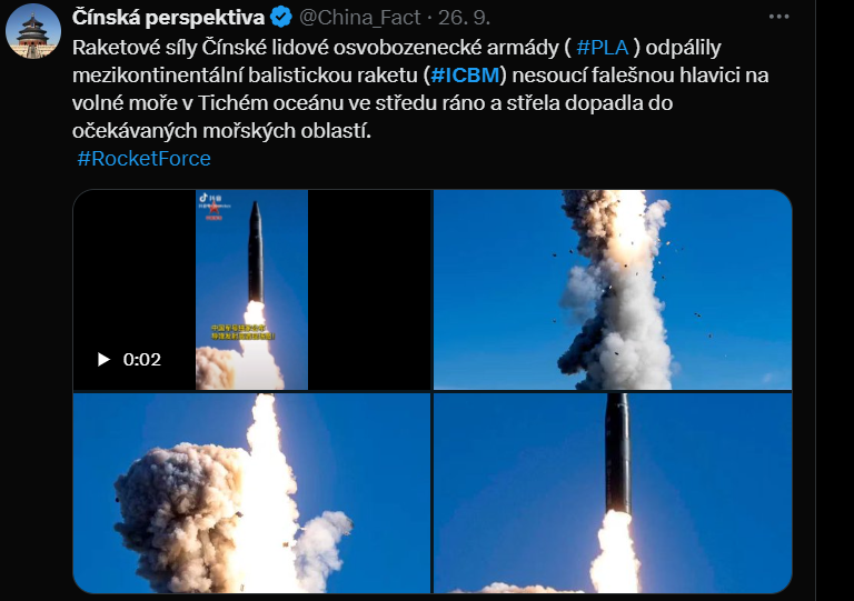 Cinska armada 25.9-odpalila s uspechem mezikontinental strelu