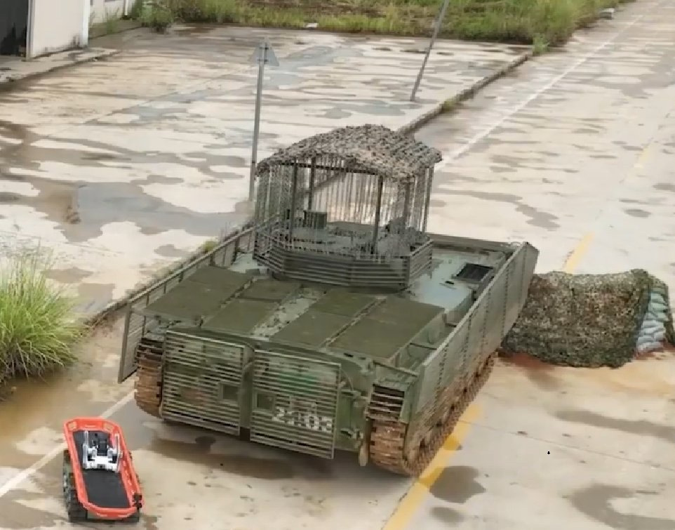 Rovněž Čína testuje a cvičí s "zaklíckovanou" obrněnou technikou. Jedná se o Typ 86 IFV s masivní protidronovou klecí, vedle něj UGV.