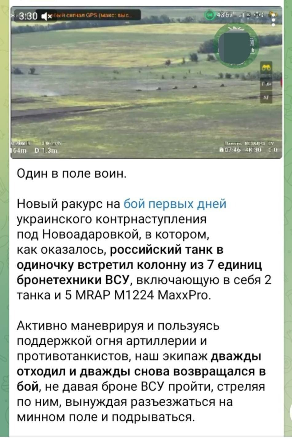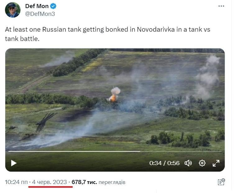 "Jedním z rysů ruské propagandy je opětovné použití starých materiálů, které již byly vhozeny do informačního prostoru a neměly očekávaný efekt. Například 29. července ruské kanály odvysílaly záběry z bitvy svých tankistů, kteří prý sami "zastavili ofenzívu ukrajinské obrněné skupiny". V zásadě jde o těžké video, protože se v něm mluví o možné smrti ukrajinských vojáků. Bohužel chápeme, že je to válka, nepřítel je zákeřný a vítězství jsou pro Ukrajinu těžká. Toto video však zdůrazňuje řadu bodů, které jsou pro Rusy smutné: Z rozhovorů mimo obrazovku je slyšet, že jim chybí protitankové zbraně ("Neexistují žádné ATGM, všechno je v pr*"); nedostatečná komunikace velitelského stanoviště taktické úrovně s ruskými tankisty v boji; fragment videa ukazuje, že hoří ruský tank, nikoli ukrajinský. Nicméně to nejdůležitější: akce je stará. Materiály byly poprvé zveřejněny 4. června, poté znovu 7. července. Od 29. července již potřetí. S maniakální tvrdohlavostí zveřejňují ruští propagandisté stejné materiály pořád dokola, dokud nedosáhnou požadovaného efektu. Podotýkáme, že se jedná o fragment bojů o Novodarivku v Záporožské oblasti, kterou ukrajinské ozbrojené síly osvobodily poměrně rychle na začátku června 2023. Tento ubohý pokus o vytvoření obrazu 'vítězství' ukazuje skutečnou tvář ruské propagandy."