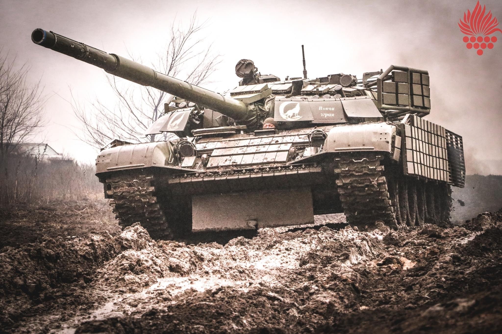 Český T-72EA, z nichž některé získaly dodatečnou ochranu věží již na Ukrajině, ve výzbroji 79. samostatné výsadkové útočné brigády.