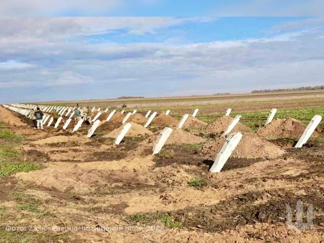 Železniční železobetonové pražce jsou nasazovány jako protivozidlové zábrany při výstavbě ukrajinské obranné linie.