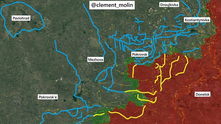 Francouzský vojenský analytik OSINT Clément Molin zveřejnil infografiku zobrazující opevněné ukrajinské obranné pozice na Donbase. Podle něj a skupiny francouzských vojenských analytiků by opuštění neokupovaných částí Doněcké oblasti bez boje bylo šílenství, protože většina ukrajinských opevněných obranných linií a pět klíčových měst se stále nachází právě tam. Molin také představil samostatnou mapu ilustrující, jak by vypadala obrana Ukrajiny, pokud by se tato území Rusku vzdala bez odporu – západní operační zóny by byly zcela "odhalené". Nejsou tam téměř žádné opevněné pozice, což znamená, že by ruské síly mohly rychle postoupit do operační hloubky, pokud by Ukrajina byla donucena ke kapitulaci a okupanti by obsadili Donbas bez boje. Takový scénář je však vyloučen: ukrajinské politické a vojenské vedení – spolu s evropskými lídry – jednoznačně odmítlo splnění Putinových požadavků. Přesně proto chce Putin získat Donbas bez boje – aby později během několika měsíců nebo roku porušil "falešnou dohodu o příměří" a zahájil rychlý postup směrem k Charkovské a Dněpropetrovské oblasti. Ukrajinské a západní vojenské rozvědky zdůrazňují, že současným tempem nemůže Rusko dobýt administrativní hranice Donbasu před srpnem 2027.