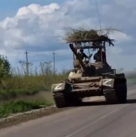 Ruský T-54 ve verzi "Čapí hnízdo". Tank původně vyvíjený tak aby měl co nejnižší profil... mno. Nejsem si jistý, co tím chtěli dokázat, ale ukrajinské drony snadno odhalí že nejde o pojízdný seník. Alespoň bude snáz hořet. Grilovací rošt kryje i motorový prostor.