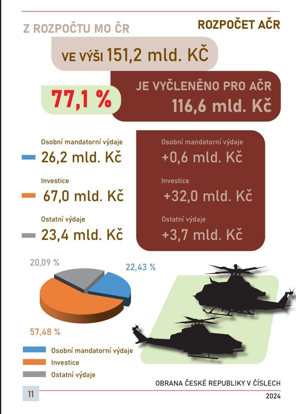 Rozpočet Ministerstva obrany na rok 2024 skokově vyroste a to na 151,2 mld Kč. Zbylých 8,6 miliardy se vezme od jiných ministerstvech jako doprava nebo vnitro. Nárůst čistě rozpočtu MO oproti současnému roku tak bude 35%. Téměř 50% rozpočtu tedy 72,5 miliardy půjde na investice, 42,6 miliardy osobní mandatorní výdaje a 36,1 miliardy jsou ostatní výdaje. Největší nárůst je v investicích, kde to oproti tomuto roku vzroste o 33 miliard.
