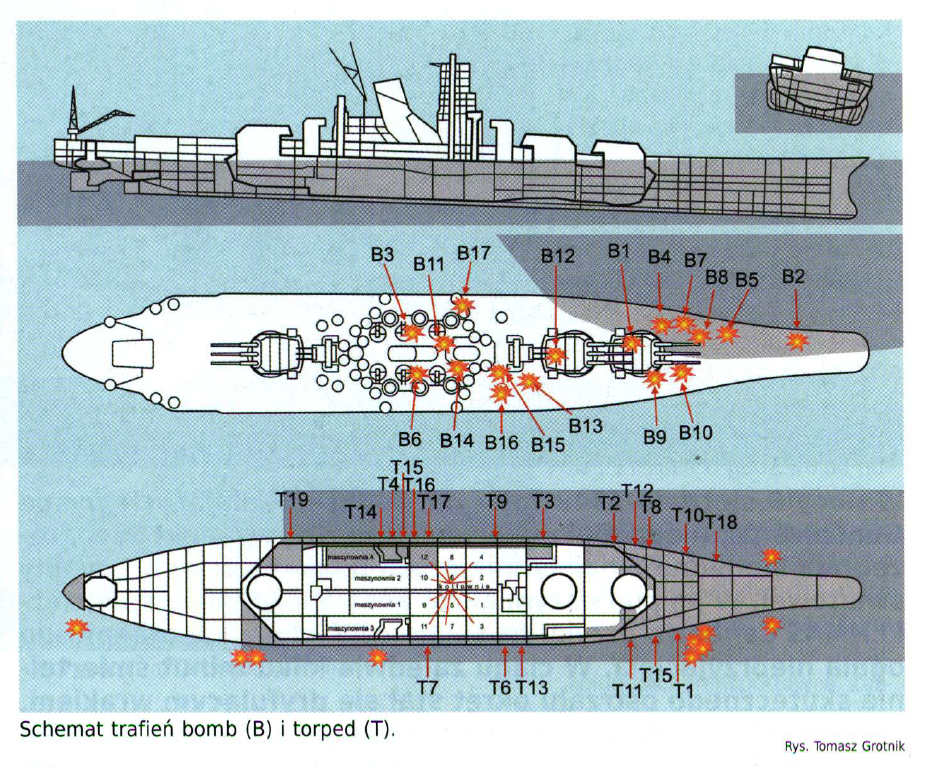 Myslím, že při čtvrtém útoku nebylo zasaženo více než jedno torpédo z pravoboku a na levoboku si nejsem tak jistý, ale určitě ne více než 2 nebo 3 a to byly poslední zásahy před potopením.