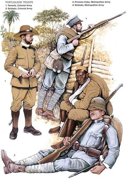 Portugalská plstěná přilba chutnou dobrůtkou afrických hmyzáků! Pád portugalské monarchie, dne 5. října 1910, přinesl hluboké změny v portugalských vojenských uniformách. Vůbec prvním opatřením, přijatým již 8. října, bylo zrušení používání královských korun na uniformách. Ve většině uniformních součástech bylo možné královské koruny jednoduše odstranit, ale nebylo tomu tak vždy. U knoflíků musely být korunky vypilovány a z přileb musely být odřezány - k tomu však moc nedocházelo a spíš byly uloženy do skladů. Nové uniformy byly nakonec přijaty výnosem ze 7. srpna 1911. Mezi ně patřila i nová přilba, oficiálně označovaná jako model 1911 "chapéu" (klobouk). Tato nová přilba byla vyrobena z vyztužené šedé plsti (ve skutečnosti látky potažené plstí). Na přední straně byly tyto klobouky opatřeny kokardou o průměru 4 cm s novými národními barvami (červená a zelená, místo královské modré a bílé) a uprostřed s číslem jednotky. Ústrojní nařízení prošla další reformou výnosem z 23. srpna 1913. V rámci tohoto procesu byla přilba z roku 1911 zrušena a nahrazena novou přilbou, oficiálně označenou jako "chapéu-capacete" (přilbový klobouk). Tato nová přilba byla vyrobena z vyztužené šedé plsti s černěným měděným hrotem. V tomto případě byla již kokarda mnohem menší a vyráběná z lisované a následně pomalované kůže. Tyto nové přilby vyráběly pouze dvě firmy: Costa Braga & Filhos z Porta a druhá neidentifikovaná, snad od nějaké britské společnosti (jsou vyrobeny z lehčí plsti a celkově jsou mnohem kvalitnější). Pokud jde o samotný hrot na vrcholku přilby, tak ten byl vyráběn z mědi, kterou bylo možno snadno černit. Kromě bodce se při cvičení a boj používal vrchol polokulovitého tvaru. Zdá se, že přinejmenším některé přilby z roku 1913 byly vydány s oběma typy (bodců). Je také pravděpodobné, že válka s Německou říší v Africe přispěla ke zrušení hrotu, který byl koneckonců významným symbolem nepřítele. Ať už byl důvod jakýkoli, mnoho jednotek zapojených do afrických kampaní za první světové války hrot nikdy nenosilo. Takový byl případ praporu námořních střelců vyslaného do Angoly v roce 1914. Byť portugalská přilba M1913 vzhledem velmi připomíná tropické přilby jiných států (vyráběných z korku), tak k tomuto účelu nebyla nikdy určena. V tomto prostředí navíc fungovala velmi špatně a na slunci se přehřívala. Navíc plsť lákala četný africký hmyz, kterému velmi chutnala. Oficiálně byla válka Německu vyhlášena až v roce 1916 a tou dobou již byla většina portugalských vojáků vybavena moderní ocelovou přilbou M1916.