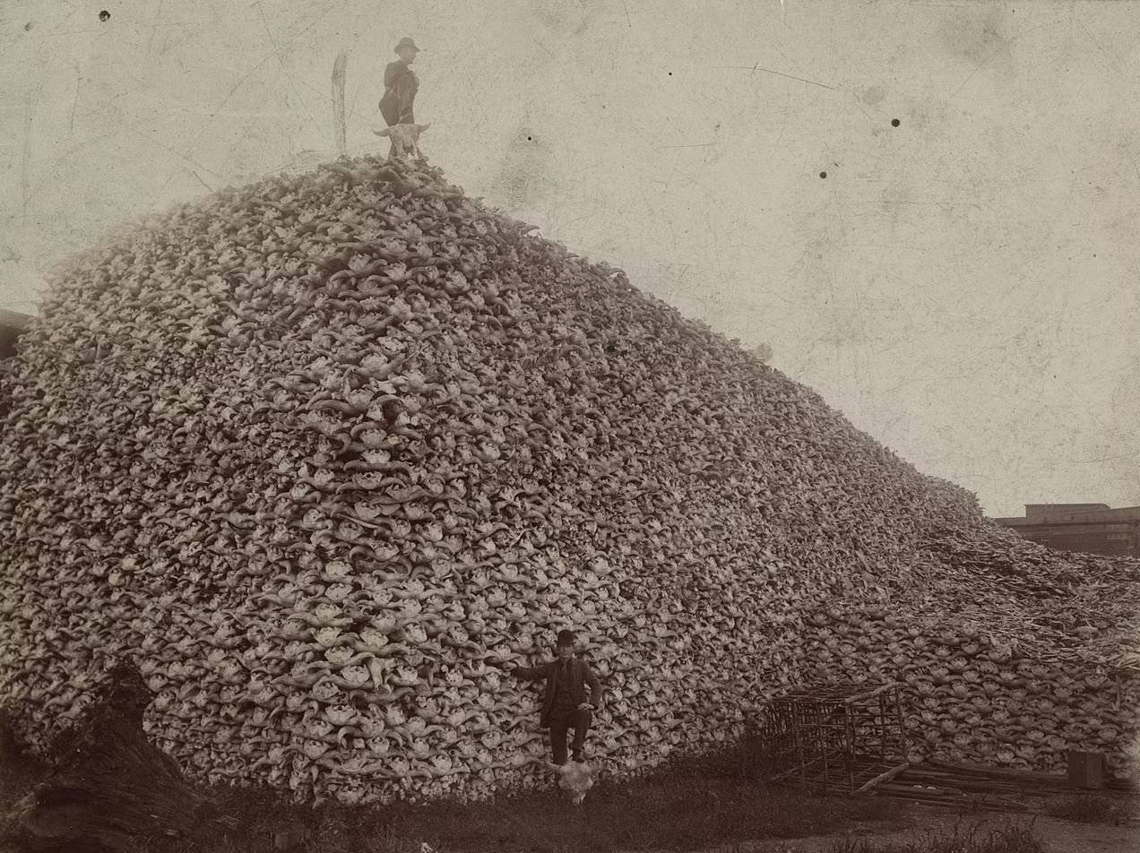 Bizoni mají jen málo přirozených nepřátel – kromě člověka to byli medvěd grizzly, vlk a výjimečně také puma, která se však odváží pouze na telata. V době před příchodem bělochů jejich počet dosahoval odhadem 30–70 milionů. První bílí cestovatelé popsali scény, kdy bizoní stáda tvořila jednolitou masu hnědých těl, pokrývající široké pláně kam až oko dohlédlo (podle některých odhadů až 100 čtverečních km). Někdy mohlo stádo bizonů zastavit cestovatele i na několik dní, než přešlo. Někteří ranní cestovatelé popisují býky, kteří neutíkali ani při ohrožení ze strany lidí, útočili a byli velmi agresívní. Roku 1871 schválil kongres úplnou likvidaci bizonů, aby tak zlomil odpor kočovných indiánů. Nastala opravdová jatka. Ročně bylo zastřeleno kolem 250 000 bizonů, někdy však lovci zabili stejné množství zvířat za jediný měsíc. Kapitán Jack Brydges z Kansasu si již v roce 1872 přichází pro odměnu za potvrzených 1142 zabitých bizonů během pouhých šesti týdnů. Vojáci z pevností střílí do stád z děl, železniční společnosti organizují pro pasažéry jako zábavu lov bizonů přímo z vlaků projíždějících prérií. Lovci stahovali jen kůže, ostatky nechali ležet na pospas mrchožravcům. Když do srdce Středozápadu dorazili první osadníci, vybělené kostry pro ně zpočátku představovaly problém, ale záhy o surovinu bohatou na fosfor projevily zájem fabriky na východním pobřeží. V závodě Michigan Carbon Works v Detroitu na řece Rouge, se tehdy z bizoních kostí vyráběl klíh, hnojivo, barviva a kostní popel nutný pro produkci kostního porcelánu a krystalového cukru. Fabrika zaměstnávala 750 lidí a zpracovávala až třináct procent všech bizoních kostí. Pro osadníky jejich sběr představoval dobrý přivýdělek, továrny za tunu kostí platily asi deset dolarů. V polovině 80. let odjíždělo na východní pobřeží asi čtyři sta vlaků naložených kostmi ročně, do jejich sběru se zapojily celé rodiny včetně dětí. O deset let později už byly Velké pláně zcela vyčištěné a sběrači kostí proto začali rabovat i indiánská pohřebiště.