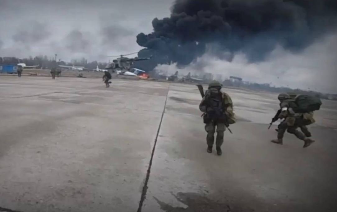 První pozemní kontakt mezi ukrajinskými a ruskými silami probíhá podél silnic mezi letištěm a základnou, kde na 2 hodiny zuří nelítostná bitva. Po dlouhém boji jsou ukrajinské síly nuceny stáhnout se, protože jim došly munice. Rychle se přesunuly na jihovýchod od základny a zmizely v okolních lesních oblastech. Rusové je nepronásledují a obsazují ukrajinskou základnu. Vyvěsí svou vlajku nad letištěm a začnou budovat obranné pozice kolem dráhy. Očekávají totiž další posily v podobě 18 velkých dopravních letounů Iljušin Il-76, převážející další brigádu ruských výsadkářů a lehkých obrněných vozidel, které téměř okamžitě vzlétají z Ruska. Kdyby byli Rusové schopni s touto silou přistát, bylo by to katastrofou pro celou obranu Kyjeva, protože tak velkou sílu by bylo jen velmi těžké zastavit.
