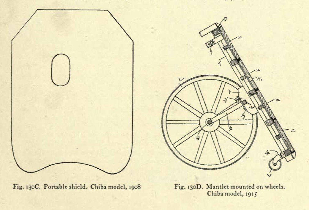 Zajímavostí je, že zkušenosti z rusko-japonské války vedly k zajímavým konstrukcím rovněž v Japonsku. Zmiňují se práce jistého pana Čiby z Tokia. Konkrétně se uvádí, že je držitelem tří patentů týkajících se pancéřové ochrany. První se týká jeho neprůstřelné vesty, patentované 17. června 1905, druhý jeho přenosného štítu a třetí jeho mobilního střeleckého štítu, patentovaného 26. října 1915. Všechny tyto obranné prvky údajně prošly úspěšnými testy. První z vynálezů pana Čiby byl prakticky vyzkoušen japonskou vládou během rusko-japonské války, kdy bylo do skutečného provozu uvedeno 300 exemplářů. V roce 1908 vláda