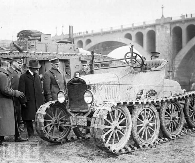 Krátce po první světové válce, ještě nějaký čas žila americká společnost z "válečného nadšení". Objevovaly se tak různé fotografie cvičících vojáků domobrany spolu s maketami tanků, jejíž konstrukce byla poplatná téměř období před rokem 1914. Není se ale čemu divit, přeci jen před vstupem USA do "evropské války" byla armáda silně upozaděná. Nyní se ale pořádaly různé dobročinné akce, kde se prezentovala armáda a nadšená veřejnost byla seznamována s moderní válečnou technikou, která pomohla zvítězit USA ve válce na kontinentu. O zmíněných podivných, propagandistických strojích, brázdící ulice amerických měst, naleznete více zde. Spousta průmyslníků se také snažila na této vlně svést a známý průmyslník Henry Martin Ford (1863–1947) nemohl být výjimkou. Na jedno z podobných představení pro veřejnost, které se konalo v únoru 1921, poblíž Key Bridge, přímo ve Washingtonu D.C., představil militarizovaný Ford Model T. Řekněme, že v této době bylo velice populární ze všeho co mělo pásy udělat tank, pokud to nemělo pásy, tak je přidat. Vznikl tak osmikolový Model T, u nějž byla krajní kola původní a mezi nimi přidány dvě další, které byly určené k snazšímu vedení pásů. Jak můžete vidět, pásy byly dosti ohebné a nejspíš jsou vyrobené z pryže. Pro udržení pásů na kolech, byly pásy vybavené bočním vedením. Výsledkem byl jakýsi Ford Model T pro jízdu v těžkém, blátivém terénu. Představení se účastnili i zástupci armády, kteří vozidlo důkladně prohlédli. Kýžený efekt se patrně nedostavil, ale i v následujících letech se Ford zabýval konstrukcí roztodivných verzí Modelu T. Jako "přímého" nástupce tohoto vozidla můžeme označit Ford Model T Snowmobile z roku 1922, nebo různé další verze určené pro jízdu ve sněhu, kdy přední řiditelná náprava byla osazena lyžinami a zadní, zdvojená náprava pásovými návleky. Poslední popsaná varianta se již těšila poměrně slušné oblibě a můžeme ji vidět na nemálo zachovaných fotografiích z konce 20. let a začátku let třicátých.