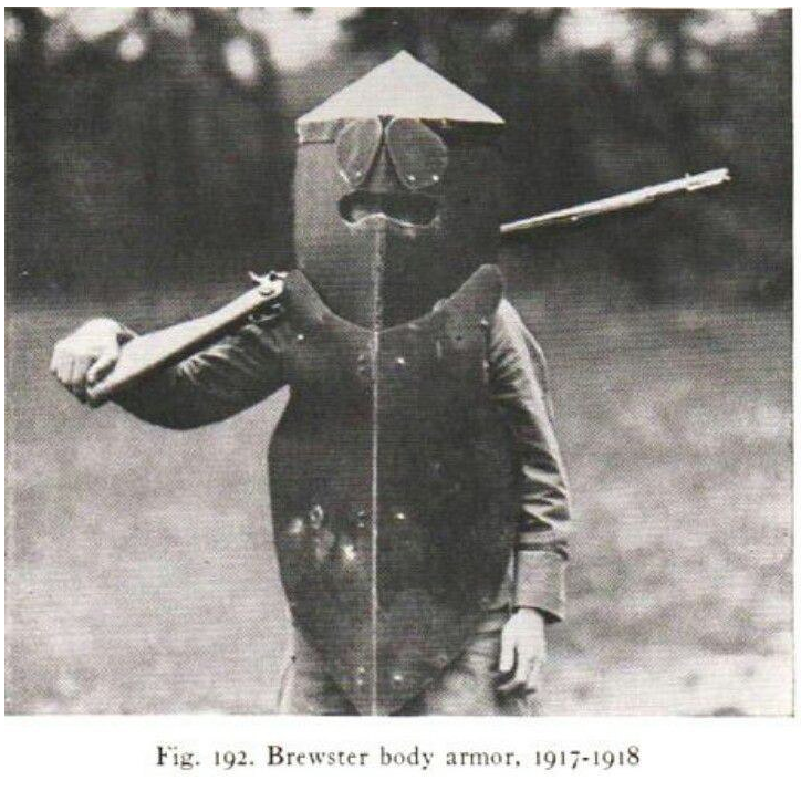 Na Kellyho primitivní brnění navázal Dr. Guy Brewster se svým brněním známým jako Brewster body armour. Toto brnění bylo navrženo až na konci války a jasně kopíruje podobné konstrukce na kontinentu nebo ze starších dob. Ač činí svého nositele relativně chráněným, údajně mohlo vydržet i palbu z kulometu Lewis, bylo příliš těžké a dělalo ze svého nositele neohrabaný terč. Přilba byla příliš těžká a neposkytovala rozumný výhled po okolí, také hrudní plát byl špatně tvarovaný a neumožňoval zacílení zbraně. Také pohyb v těsném zákopu byl velice komplikovaný, nemluvě o pohybu mezi krátery naplněnými vodou, které byly smrtící nástrahou i pro vojáky v běžné výstroji. Výše popsané zápory ale Dr. Brewstera nezastavily a rozhodl se svůj produkt prezentovat zástupcům armády. Napadl jej bláznivý plán, kdy se oblékl do svého brnění a následně se nechal ostřelovat vojáky. Patrně počítal s tím, že se vojáci spokojí s jedním nebo dvěma výstřely, leč následoval "déšť kulek". K úlevě všech zúčastněných, ani jeden projektil neprošel skrz masivní pancíř nebo nezasáhl nechráněné místo. Následovala tedy zkouška s kulometem Lewis, rovněž ku spokojenosti zástupců armády i samotného prodejce. Odvaha mu očividně nechyběla a po zkoušce popsal zásahy jako "rány kladivem". Patrně nepřekvapí, že ani tento model nebyl nikdy zařazen do výzbroje US Army a zůstalo jen u této dobrodružné příhody.