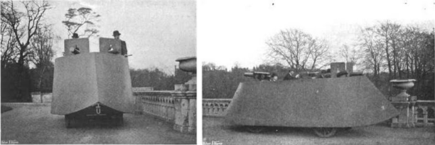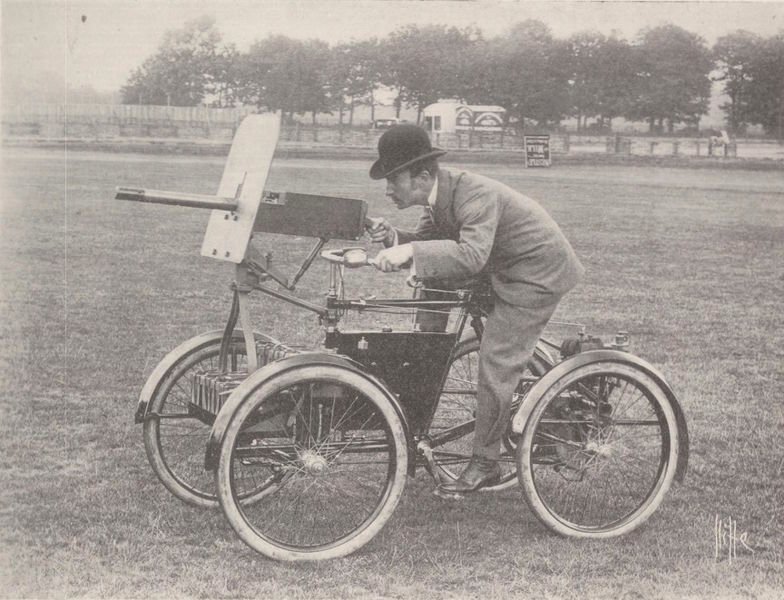 Jako první vojenský automobil, je považována čtyřkolka zvaná Military Scout, nebo doslova Armored Quadricycle, který navrhl britský vynálezce, inženýr Frederick Richard Simms (1863–1944). Rovněž je otcem prvního obrněného vozidla a obrněné drezíny. Frederick Simms se narodil v Hamburku, později studoval v Berlíně i Londýně. Velice se zajímal o techniku, v roce 1889 se spřátelil s Gottliebem Daimlerem, od něhož zakoupil licenční práva na konstrukci vysokorychlostního petrolejového motoru, pro Británii a její kolonie. Později zde založil společnost na výrobu motorů - Daimler Motor Syndicate Limited. Vyráběné motory Daimler osadil na automobily Peugeot a Panhard, přičemž se s nimi účasnil závodu Paris-Rouen v roce 1894. Následujícího roku, Simms a Evelyn Ellis, zakoupili ve Francii a odvezli do Anglie automobil, který se stal prvním autem poháněným spalovacím motorem (na petrolej) v Británii. V roce 1896 koupil původní společnost Harry Lawson (1852–1925), která se tak stala součástí společnosti BMS (British Motor Syndicate Limited). Simms zde sice zůstal konzultantem, ale nepřipojil se do představenstva společnosti. Téhož roku totiž stal ředitelem Stuttgardské společnosti Daimler Motoren Gesellschaft (později Daimler-Benz). v této době byl velice aktivní a pendloval mezi Británií a Německem. V roce 1897 založil Automobile Club of Great Britain (později RAC) a spolupodílel se na založení Royal Aero Club.