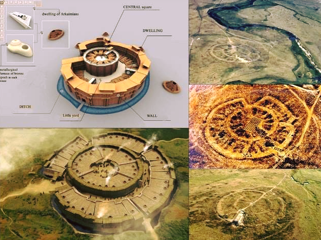 Pozůstatky města Arkaim byly nalezeny roku 1987 uprostřed pusté stepi jižního Uralu, daleko od železničních a silničních cest asi 450 km od Čeljabinsku. Průzkum lokality zahájili archeologové z Čeljabinské univerzity, kteří odkryli ruiny starověkého města a pomocí radiouhlíkové metody stanovili stáří zhruba na 4000 let. Vykopávky nejprve odkryly části zdí, které byly silné 4,5 - 6 metrů, před každou stěnou byl vyhlouben příkop. Arkaim byl okrouhlý s vysokými věžemi a zvnějšku obložený barevnými glazovanými cihlami. Obydlí byla schována za mohutnými obranými stěnami, postavenými z hlíny a dřeva. Oproti tehdejším civilizacím na jihu je zde kámen využíván jen velmi zřídka, pouze u menhirů. Mohutné lichoběžníkové domy byly plánovitě sestaveny jeden vedle druhého, jako loukotě u kola. Po střechách obydlí (ve výšce 3,5 m) vedla cesta pro pěší a vozy. Díky této soustavě vrchních a spodních ulic, vstupních otvorů na střechách domů, se mohl člověk dostat co nejkratší cestou na libovolné místo. Tloušťka stěn domů činila 60 cm a mezi domy nebyly žádné dveře ani průchody, pouze schodiště. Uprostřed města se nacházelo náměstí, patrně určeno pro náboženské obřady. Zachovali se dvě okrouhlé obrané stěny zapasované jedna do druhé, byla tu i třetí, která opásala sídliště v řadě břehové linie, utvořené říčkami Velkou Karagankou a Utjagankou. Archeologické výzkumy odhalily kanalizační soustavu; byly prozkoumány části vodovodu ze dřevěných trubek omáznutých hlínou.