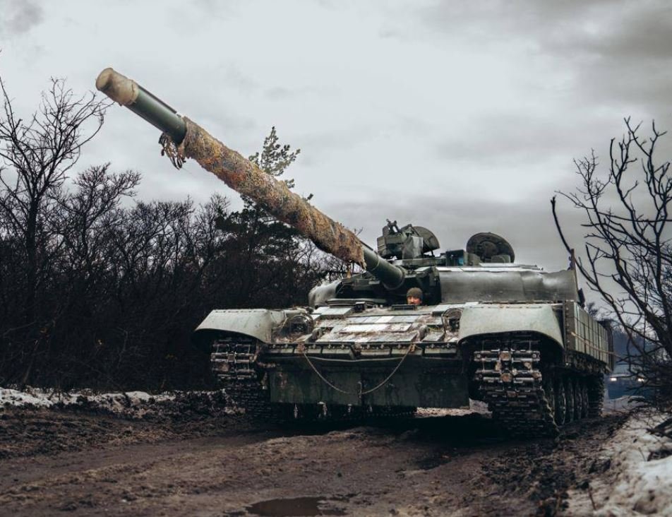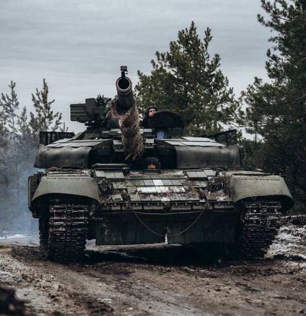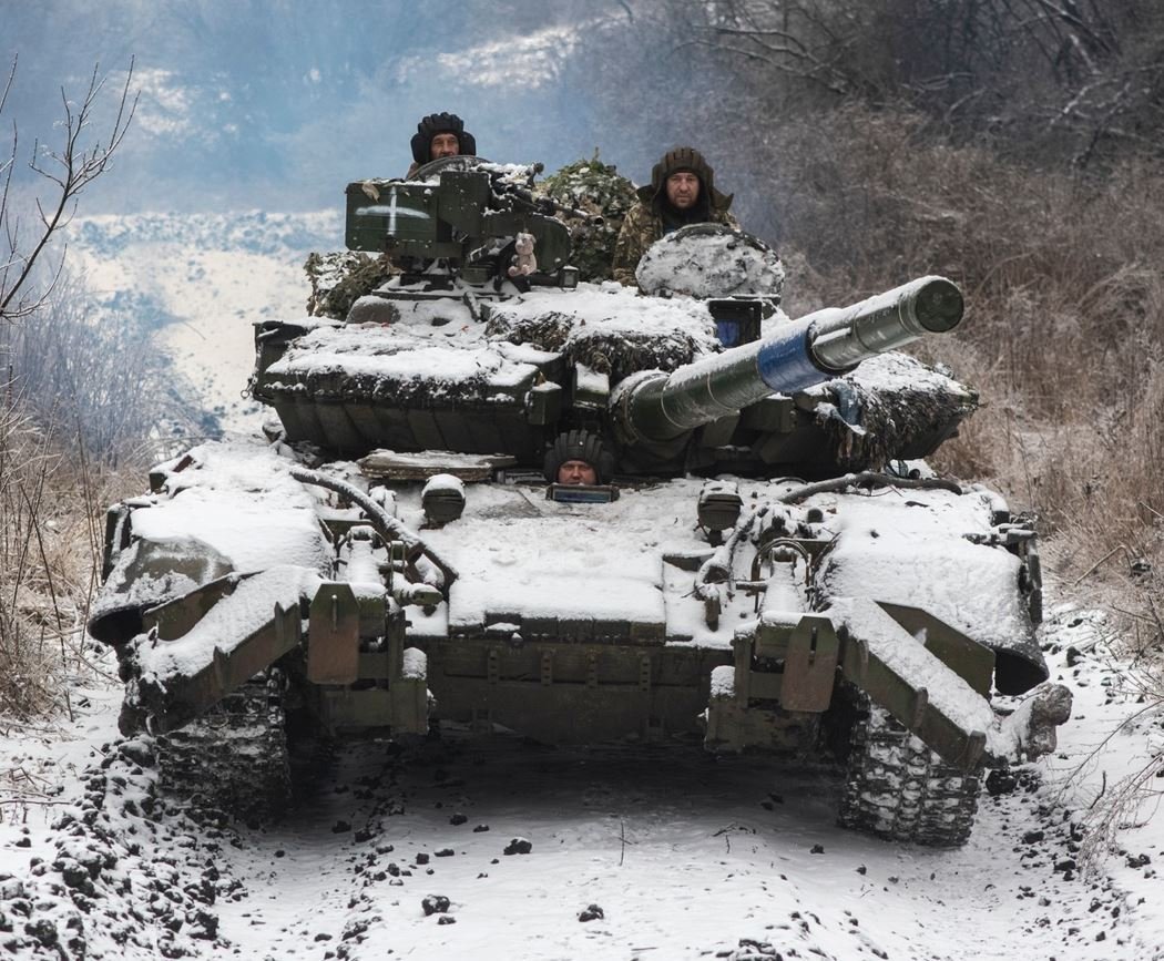 Ukrajinský T-64BV při přesunu na bojové pozice u Bachmutu, v roce 2023.