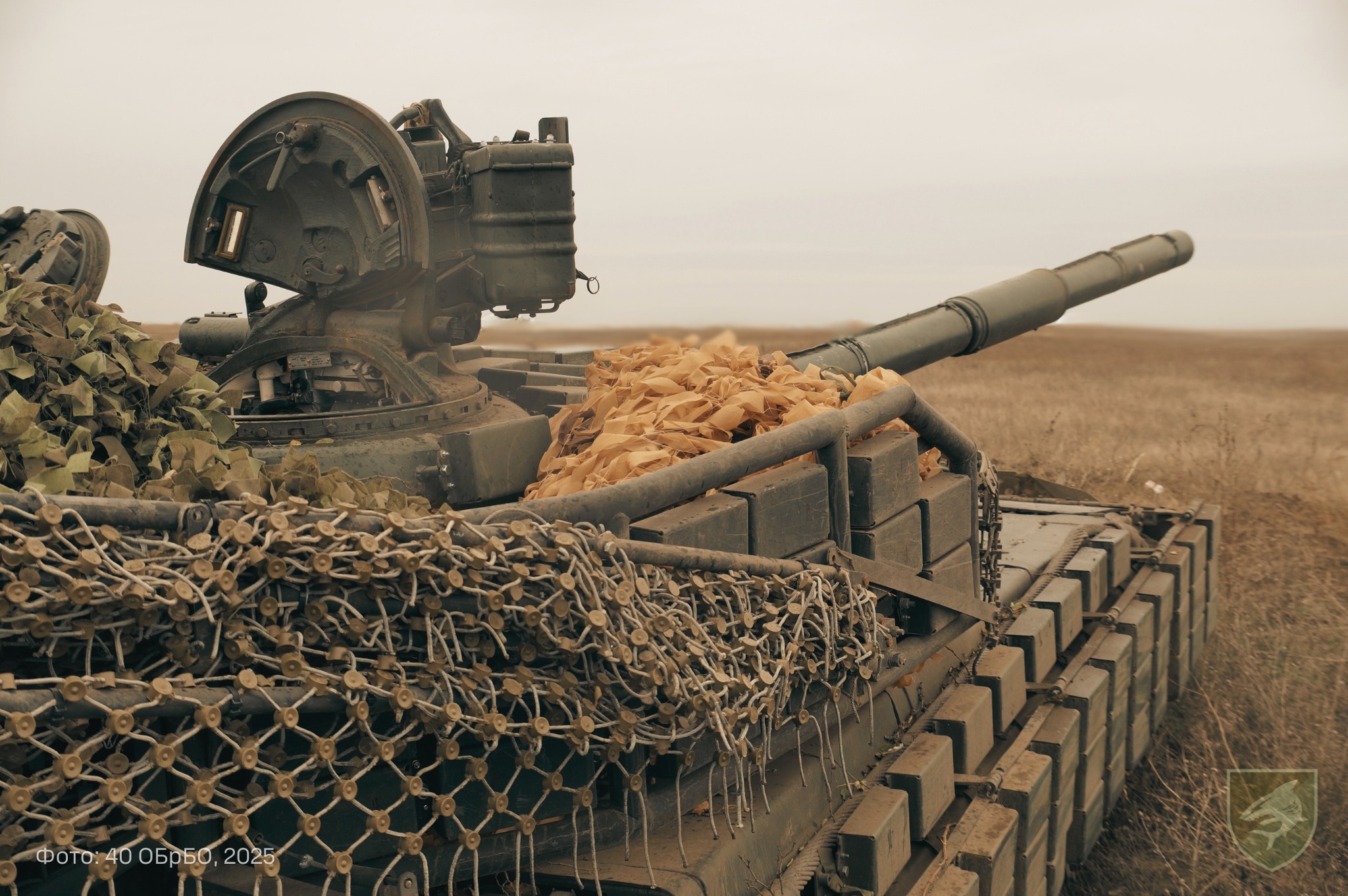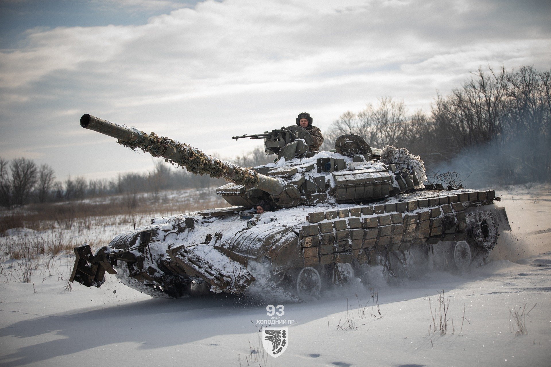 Vánočně vyzdobený ukrajinský T-64BV model 2022 od 28. samostatné mechanizované brigády, kdesi poblíž Bachmutu.