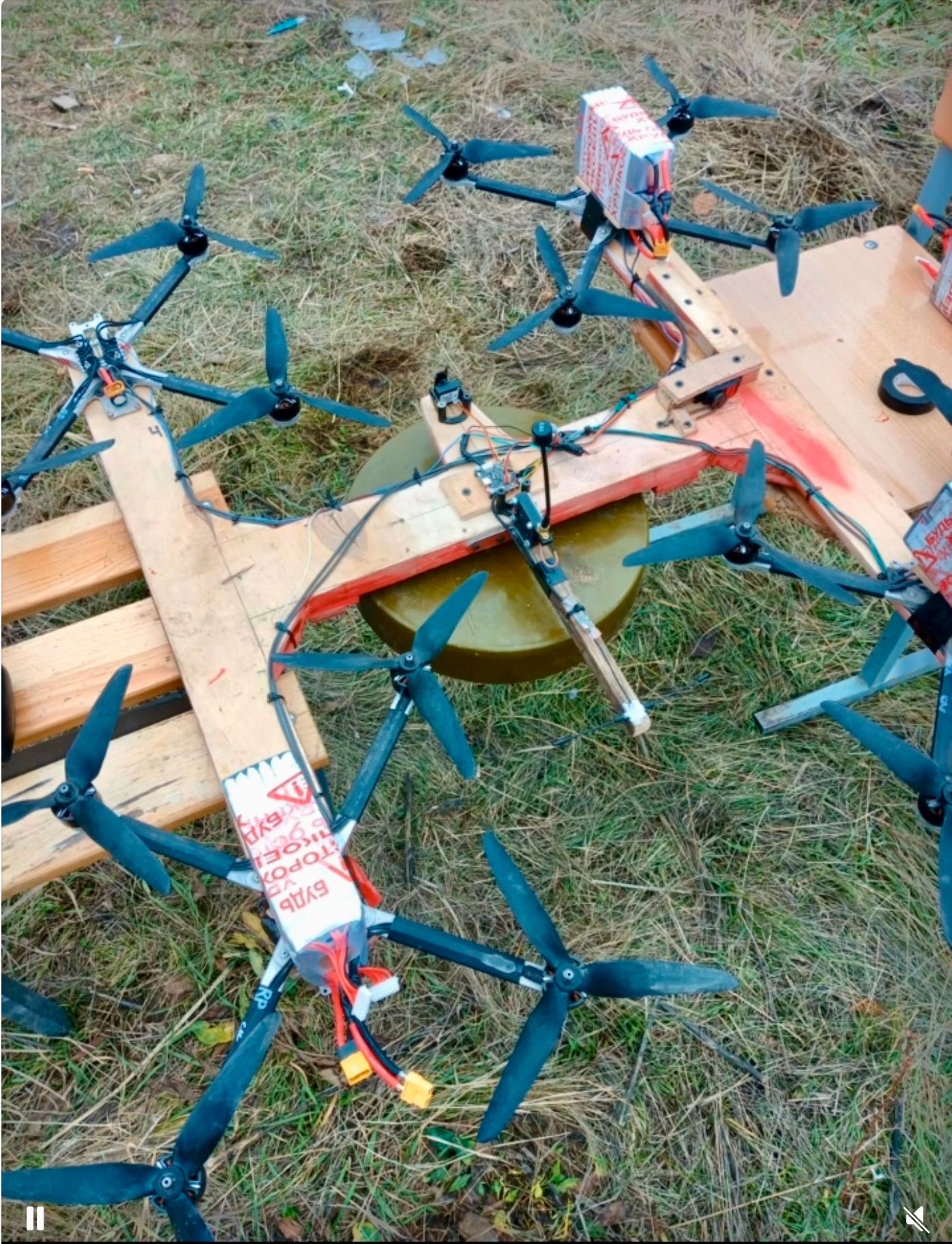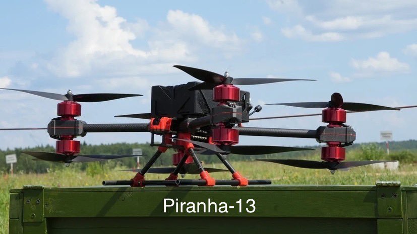 Zatímco Ukrajina má již dlouho těžkotonážní drony jako je "Vampire" (Baba Jaga), ruské ekvivalenty doposud kupodivu chyběly. Důvodem je, že Rusko trvá na domácí produkci dronů, místo aby následovalo zjevnou cestu získávání těžkých dronů z Číny. Nově rusové představili oktokoptéru "Piranha-13", o níž tvrdí, že se dostává k jednotkám dronů. Zjevně může nést protitankovou minu TM-62, což je klíčová schopnost, kterou Ukrajina již dlouho vlastní, zatímco Rusko se omezilo na shazování protipěchotních min, jako jsou POM-2 nebo PFM-1. To Ukrajině umožnilo provést úspěšnou kampaň zadržování ruských logistických a rotujících vozidel s protitankovými minami svrženými drony, jako je TM-62 a zejména PTM-3. Akorát se ukazuje, že onen ruský dron "Piranha-13" bude nejspíš jen prototypem. Výsledkem je, že ruský průmysl dokázal vytvořit jen jakési provizorní slepence jako je tento. Jednoduše spojili čtyři FPV drony (plecháče, které zvládají doslova chrlit ve velkých počtech) osazené na centrálním nosníku. Každá z kvadrokoptér funguje jako jeden motor, přičemž její čtyři vrtule se otáčejí stejnou rychlostí.