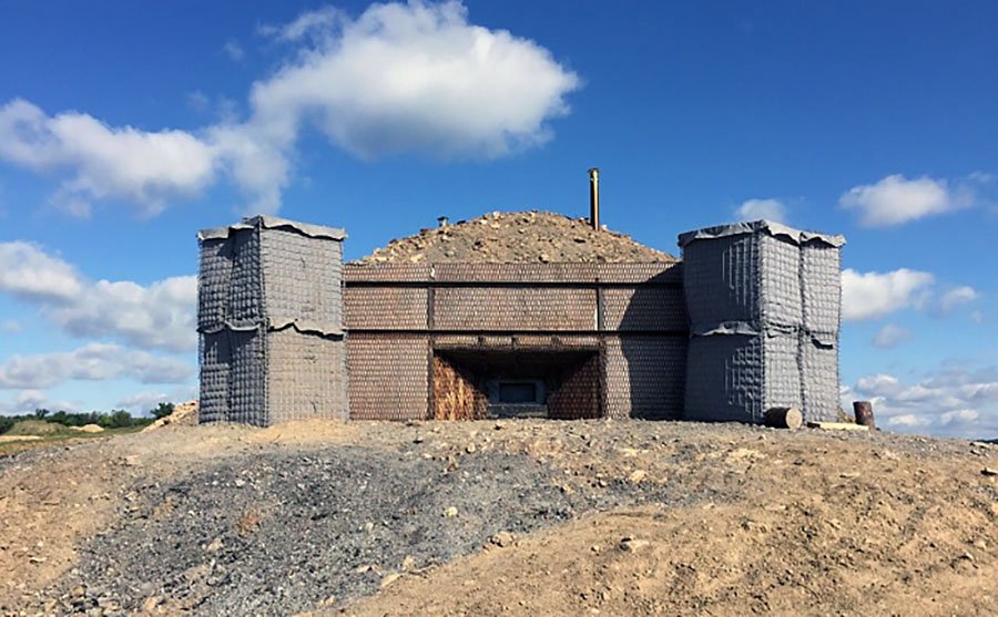Třístřílnový objekt u Žytomyru nemá mříž proti kumulativním střelám, zato je celý obložen gabiony.