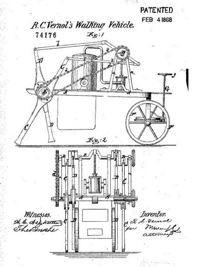 V roce 1868 si nechal američan R. C. Vernol, patentovat kráčející stroj - Walking Vehicle. V podstatě se jednalo o klasický parní stroj, který měl místo zadní kolové nápravy jakési chůdy, nebo nohy bez kloubů. Ty stroj pomalu odrážely. Patent získal číslo 74176.