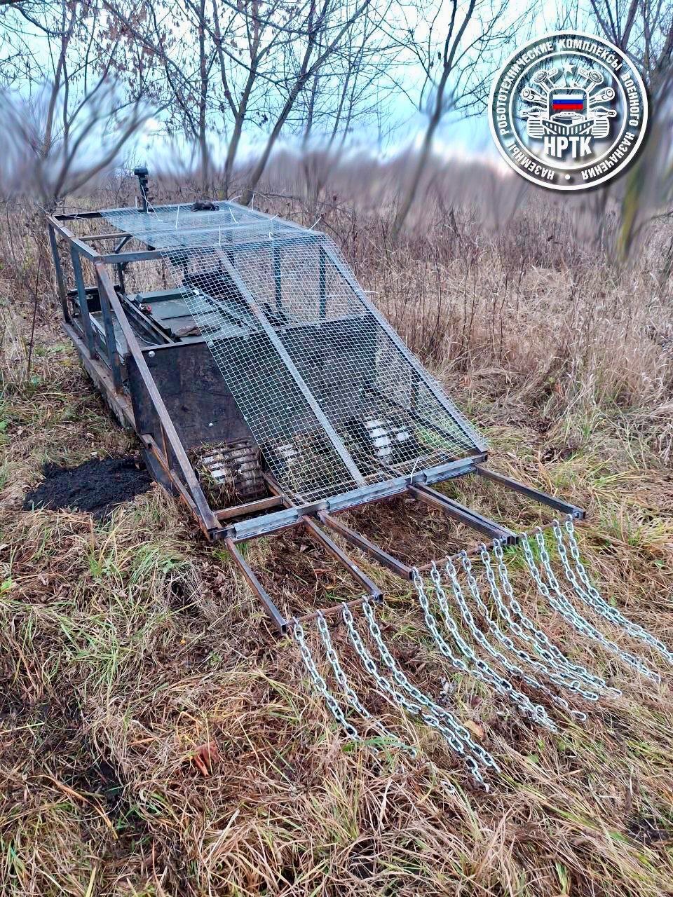 Ruský pozemní dron "Courier" s ochranou proti FPV dronům a vlečnou sítí proti nášlapným minám. Ukrajinské magnetické miny PTM-U (cca 1,5 kg výbušnin) shazují těžké drony na ruské zásobovací trasy a Rusové doufají, že ocelové řetězy je od bezpilotního vozidla odpálí dostatečně daleko, aby mu umožnily přežití.