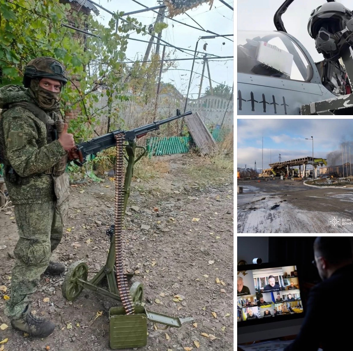 Foto: Ruský voják a jeho kulomet proti dronům z roku 1943. | Zářezy ukrajinské stíhačky Mirage 2000. | Rusové vybombardovali benzínku. | Zelenský na pracovním callu.