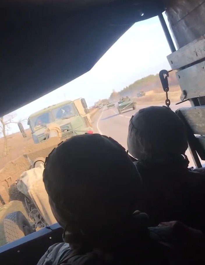 Video zachycující chaos prvního dne ruské invaze na Ukrajinu. Kolona ukrajinského dělostřelectva z 59. samostatné motorizované brigády čekající na silnici poblíž Olešek v Chersonské oblasti sleduje kolonu ruských BMP, která ji míjí směrem k Antonivskému mostu. Ukrajinští vojáci vědí, že jde o Rusy, ale Rusové je nejspíše zaměnili za své vlastní jednotky a nezahájili palbu. Většina 59. samostatné motorizované brigády byla v první den invaze na základně Radensk, a během noci se část brigády přesouvala k hranicím. Po začátku invaze dostaly zásobovací vozy a dělostřelectvo rozkaz k ústupu a bojové jednotky zahájily zdržovací akce, než se začaly stahovat k Oleškám. Rusové však byli rychlejší, dorazili do Olešek jako první a překročili zde Antonivský most vedoucí do Chersonu. Odříznutí ukrajinských jednotek na východním břehu Dněpru nakonec zabránila tanková rota 59. samostatné motorizované brigády, které se podařilo okupanty potlačit a vedení brigády se nakonec podařilo stáhnout většinu svých sil do Chersonu.