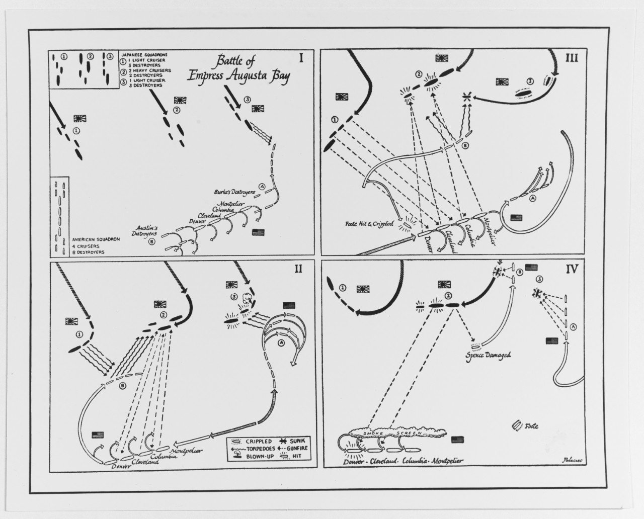 Ve 2:27 radiolokátor na MONTPELIERU zaznamenal 3. eskadru torpédoborců vzdálenou 32 800 m a střet nazvaný historiky bitva v Zátoce císařovny Augusty se stal nevyhnutelným, přičemž Američané měli díky technické převaze možnost prvního výstřelu. Aby tuto výhodu nepromarnili, Burkeho 45. divize torpédoborců už o čtyři minuty později vyrazila do útoku, ale sotva jeho lodě pohltila temnota, na obrazovkách radarů se rozzářila další „souhvězdí“ a americký kontradmirál si uvědomil, že nepřítel své síly rozdělil na tři formace. Proto nařídil obrat o 180° na pravobok, při němž se však FOOTE oddělil od zbytku divize, takže když ve 2:45 fregatní kapitán Austin zamířil na západ, aby napadl japonskou pravou kolonu, držely se v úplavu za jeho vlajkovým SPENCE pouze THATCHER a CONVERSE.