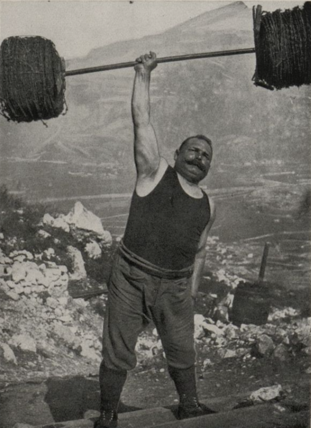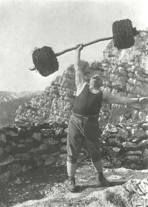 Před vypuknutím první světové války byl Gottfried Huber amatérským šampionem Rakouska-Uherska v řecko-římském zápase a vzpírání. Na frontě sloužil u Standschützen praporu z Kufsteinu, což byla domobrana v hornaté oblasti Tyrolska na hranici s Itálií. Standschützen rekrutovali muže příliš mladé a příliš staré pro běžnou armádu, přičemž nejmladšímu bylo 14 let a nejstaršímu 80. Gottfried Huber to zde dotáhl až na poručíka. Když tento rakousko-uherský sportovec a silák nebojoval, zvedal cívky s ostnatým drátem. Zde na fotografii kdesi na italské frontě kolem roku 1916. Pokud vás zajímá hmotnost oné "činky", tak jedna cívka s návinem 380 metrů drátu, vážila zhruba 34 kilo.
