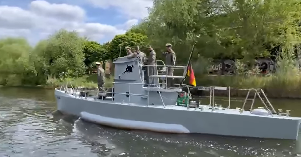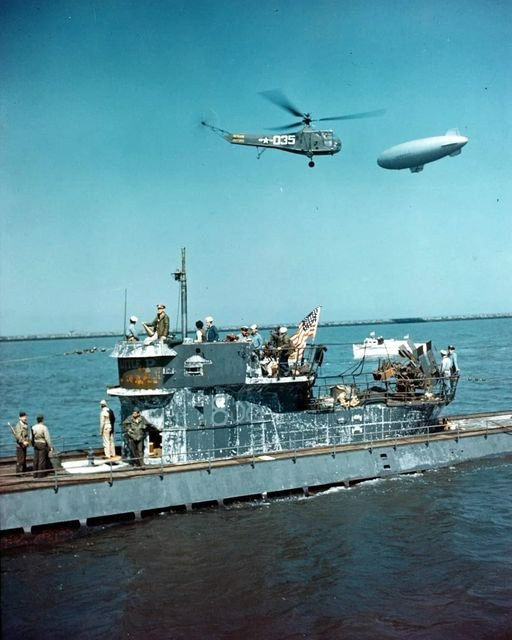 Kapitulace německého U-Bootu po ukončení bojů v čtyřicátýmpátým. Ten vrták je Sikorsky R-4, první bojově nasazený vrtulník.