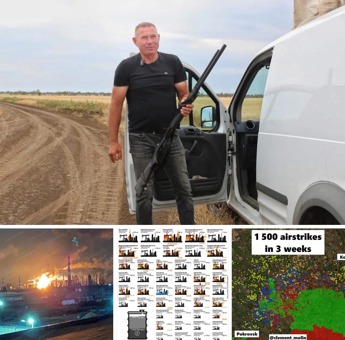 Foto: RIP Oleksandr. | Rjazaň. | Přehled zasažených ruských rafinérií. | Mapa ruských náletů u Pokrovsku.