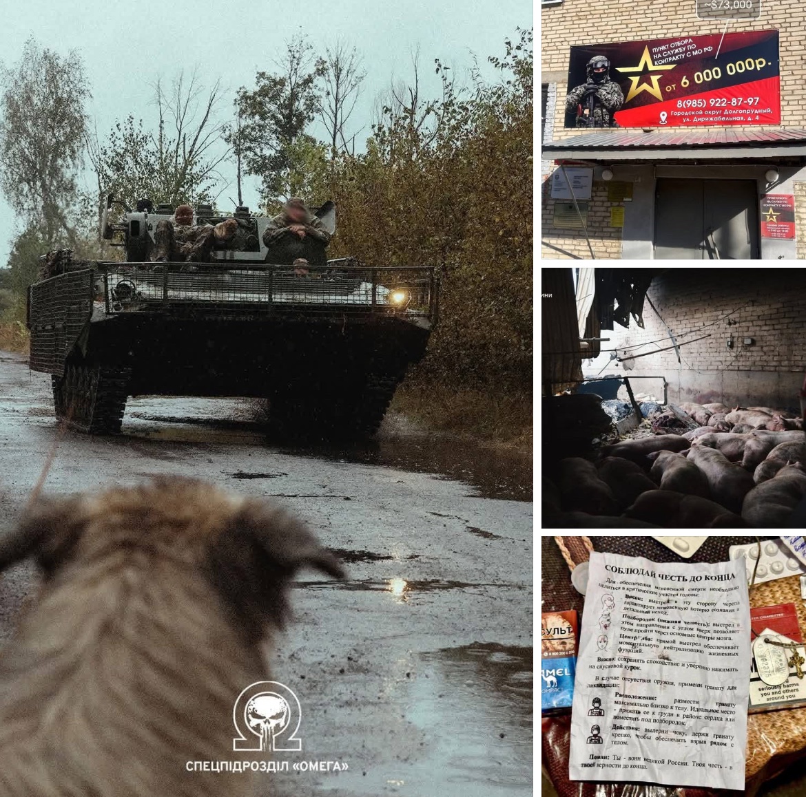 Foto: Na frontě. | Ruská náborová reklama. | Zasažený vepřín. | Ruský návod, jak se dobrovolně demobilizovat.