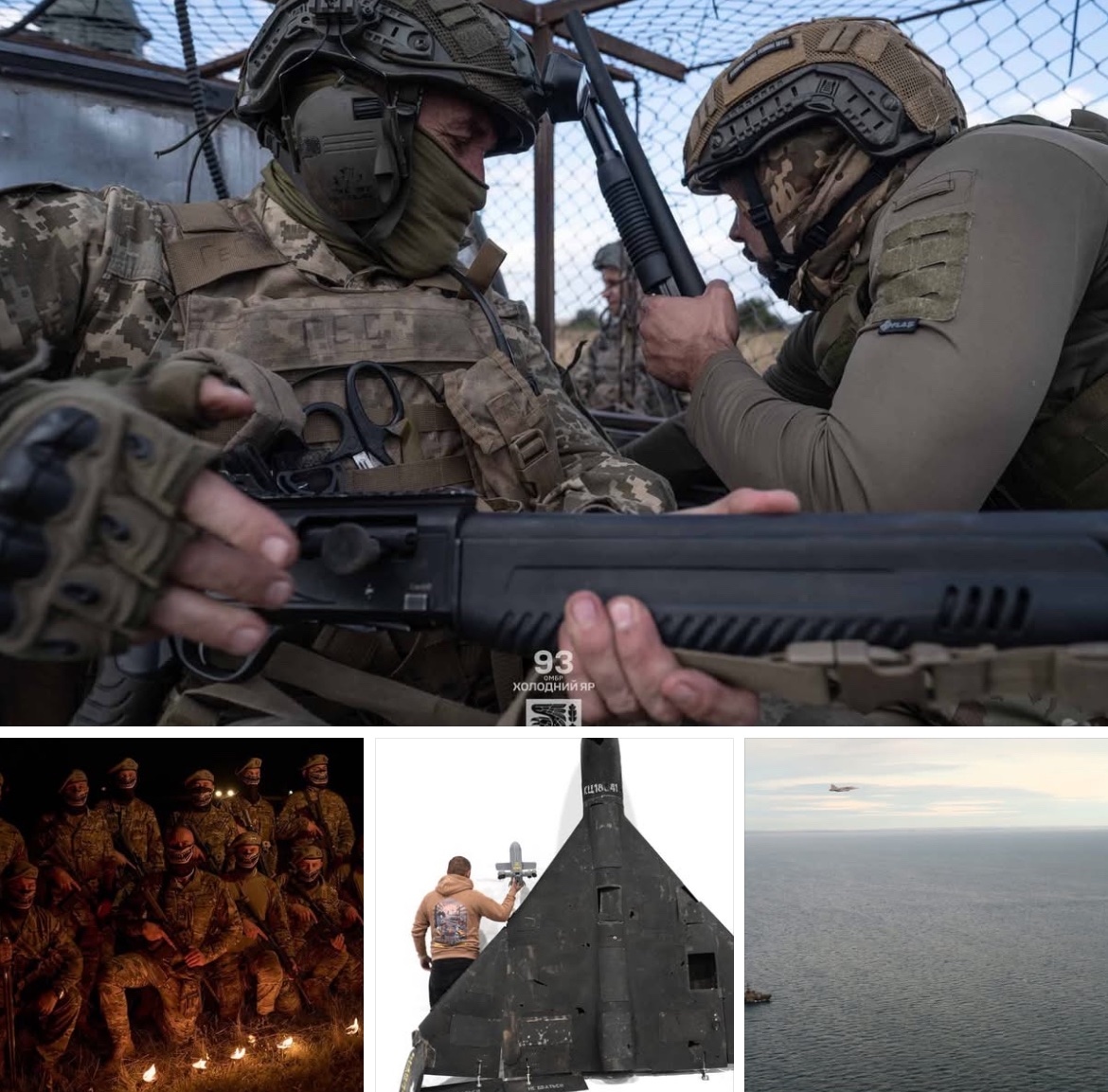 Foto: S brokovnicí proti dronům na frontě. | Noví členové speciálních jednotek. | Porovnání velikostí ruských kamikadze dronů a ukrajinských interceptorů. | Švédská loď a stíhačka sledují ruskou ponorku v Baltském moři.