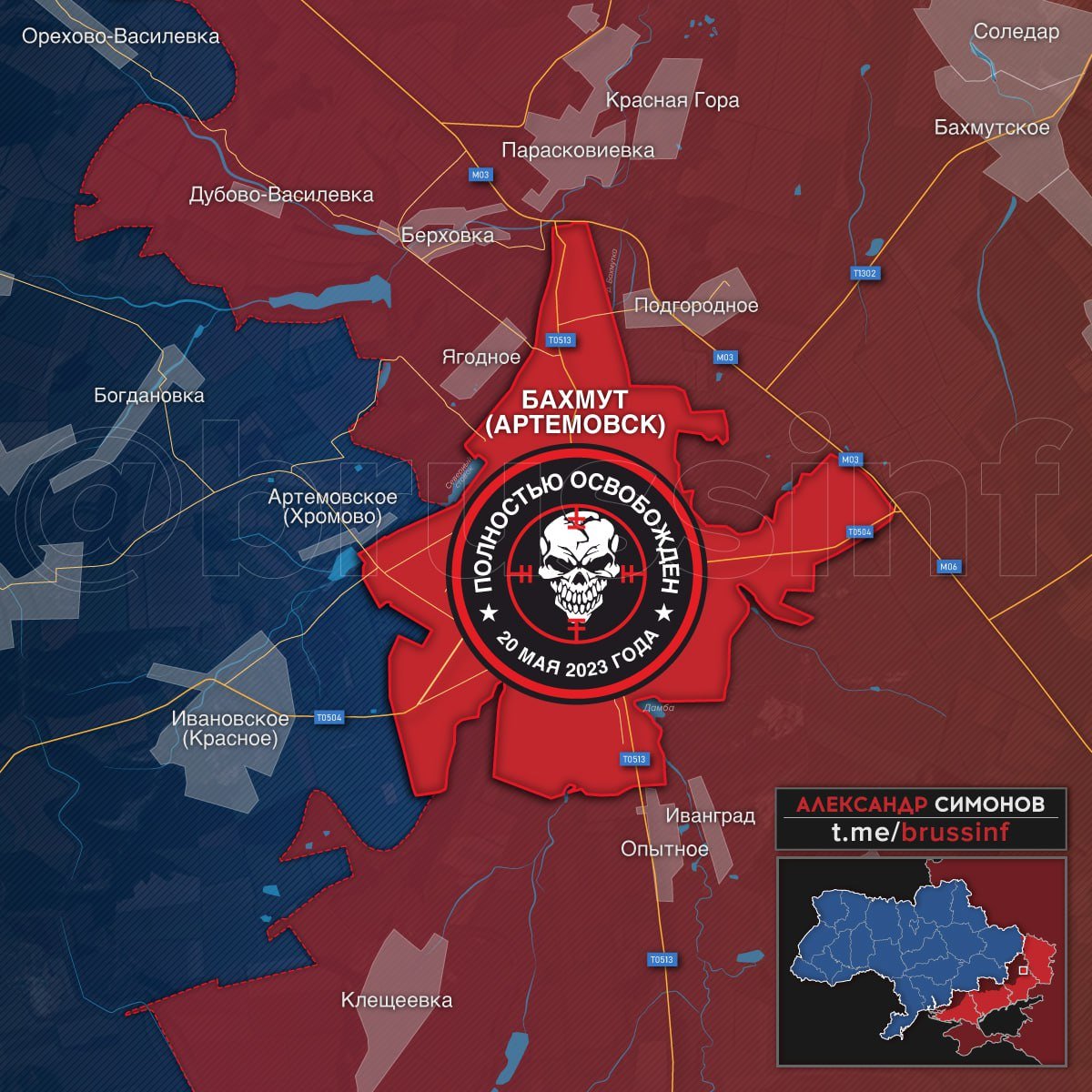 Bitva o Bachmut se chýlí ke konci. Ruská armáda se zmocnila citadely. Rusko kontroluje 99 % města. V tuto chvíli se poslední zbývající ukrajinské síly stále drží na 1 km dlouhé ulici. S největší pravděpodobností se jedná o zadní voj, který má chránit ústup bachmutské posádky směrem k Ivanovskoje a Časov Jar.