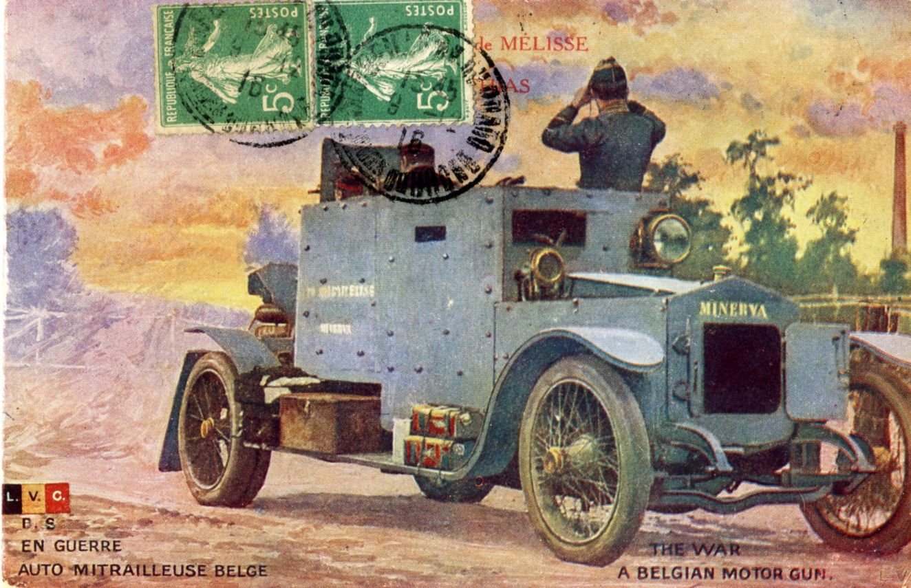 Dne 4. srpna 1914 vstoupila německá vojska do neutrální Belgie, aby se tak vyhnula francouzským pevnostem v pohraničí. Belgická armáda se opírala o pevnost Lutych a zaujala obranná postavení za Gette, aby tak chránila Brusel. Dne 20. srpna vstoupili Němci do hlavního města a téhož dne stanuli před městem Namur, poslední pevností bránicí průchodu do Francie podél reky Maasy. Armáda se stáhla na pozice před Antverpami a belgická vláda uprchla do exilu v Le Havru. Byť Belgická armáda bojovala urputně, Němcům jejich časový plán vycházel bez větších komplikací - nebýt odporu, byli by dokonce v pětidenním předstihu. Průchod na Francii byl volný, byť Belgičané bojovali dál. Záložní poručík Charles Hencart, konstruktér automobilky Minerva dal koncem srpna, na svoje náklady vyzbrojit kulomety a opancéřovat dva velké osobní automobily Minerva Tourer. Síla pancíře vyrobeného firmou Cockerill z Hobokenu byla pouze 4 mm. Výzbroj obstarávaly kulomety Hotchkiss ráže 8 mm vybavený pancéřovým štítem. Osádky mohlo tvořit až šest mužů, bojové nasazení obrněných automobilů připomínal nasazení jezdectva. Vozidla podnikala průzkumné mise na velké vzdálenosti, podporovaly pěchotu a podnikaly záškodnické výpravy do týlu nepřítele. Dne pátého září 1914 došlo u městečka Zammel k střetu mezi dvěma obrněnými Minervami a plukem zhruba 450 německých hulánů. Z nich bylo dvacet pět zabito, desítky raněny a zbytek uprchl. Na belgické straně padl zmíněný poručík Hencart. V této době již belgická armáda disponovala třiceti obrněnými automobily Minerva a SAVA. Když na podzim 1914 válka přešla z mobilní do poziční, ztratily obrněné automobily svou údernou sílu a byly tak nadbytečné.