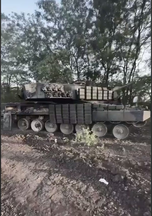 Poškozený Leopard 2 se sovětskou dynamickou ochranou Kontakt 1