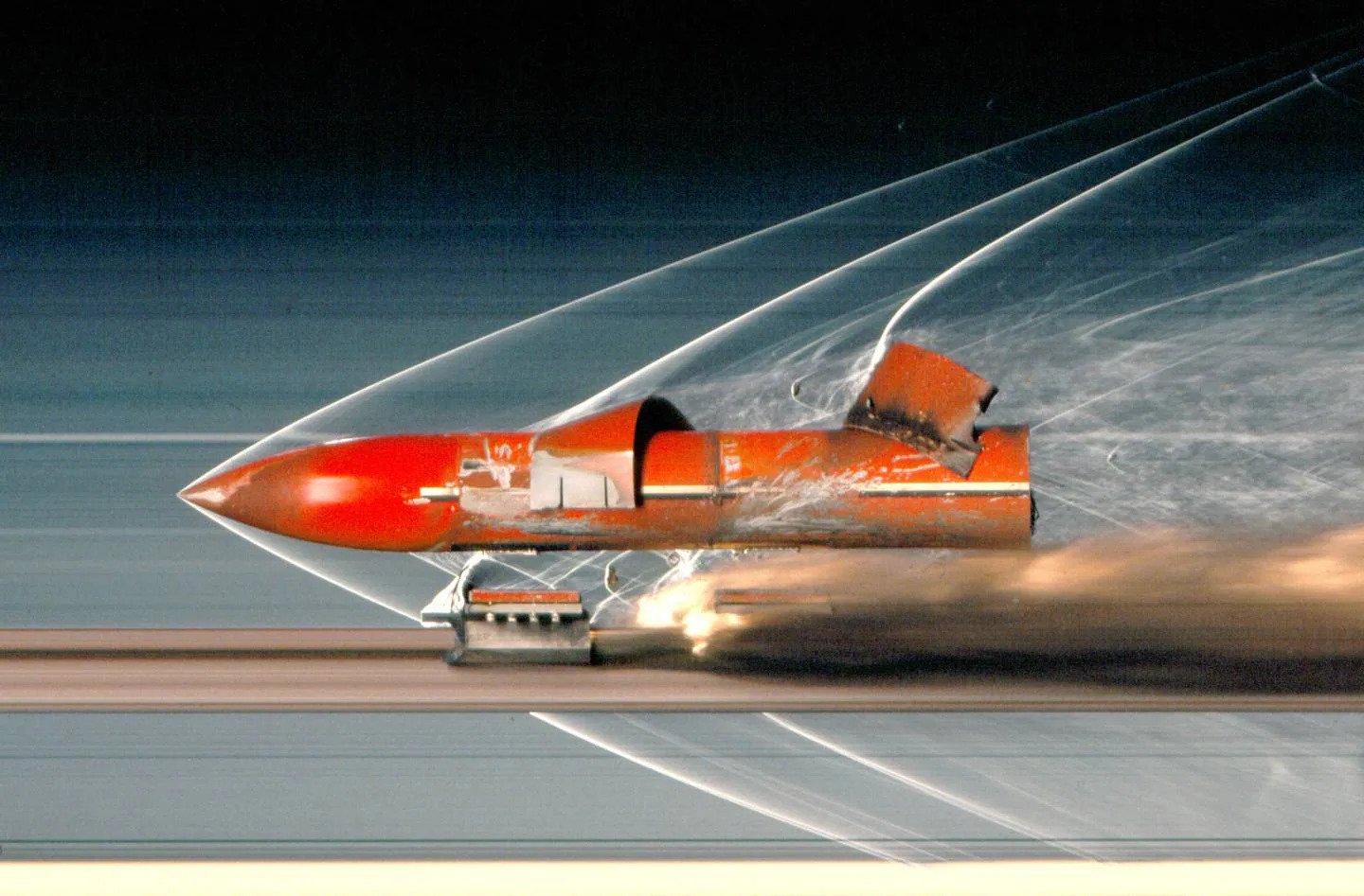 Penetrační těleso na raketových sáních při experimentu na Holloman High Speed Test Track, Holloman Air Force Base. Zdroj: US Air Force