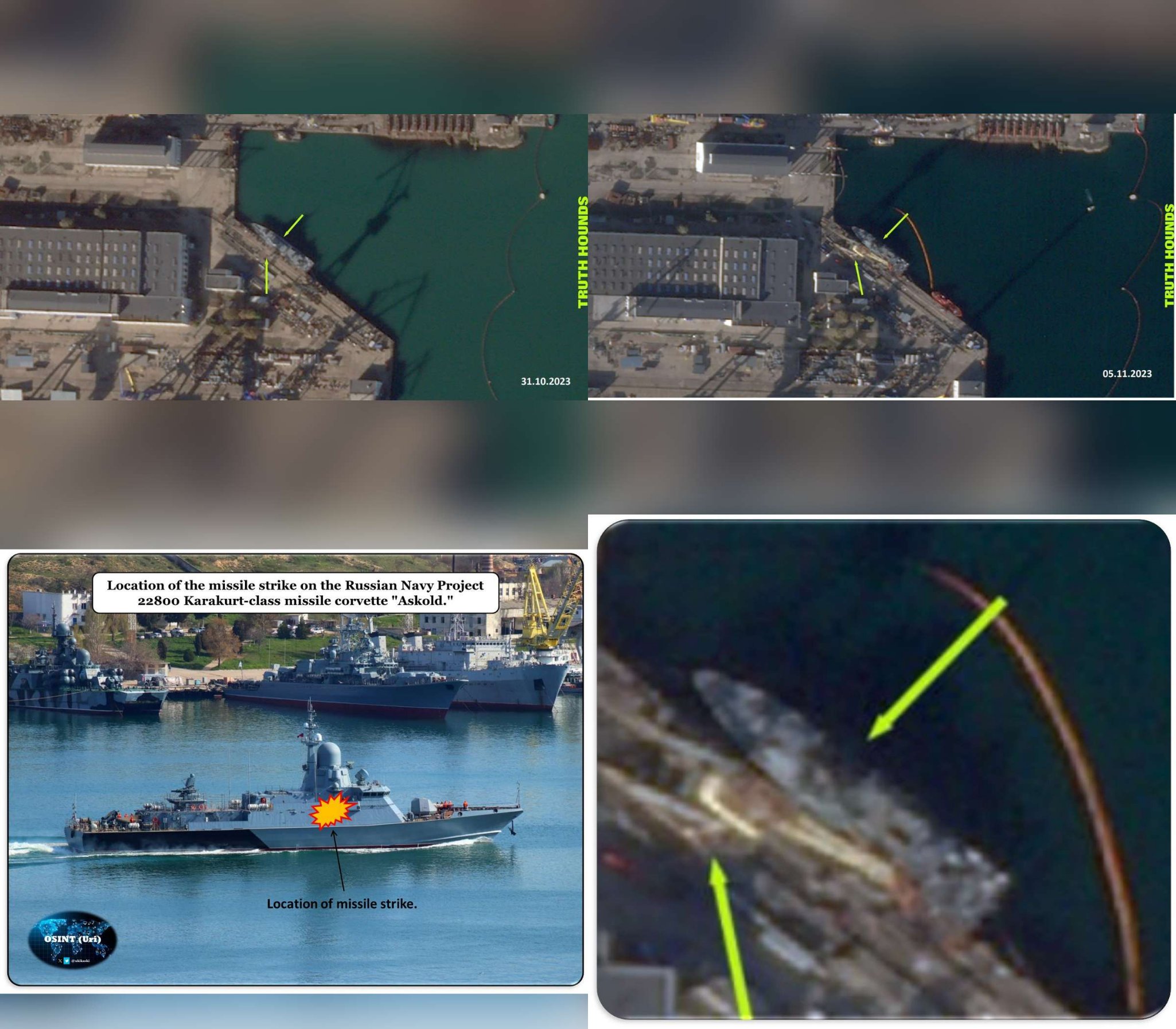 Ruská korveta třídy Karakurt "Askold", která byla 4. listopadu 2023 zasažena několika raketami (Repost) v loděnici na Ruskem okupovaném Krymu, nemůže být opravena. Informoval o tom kanál Telegramový kanál Crimean Wind. Rusko nedávno převedlo do Černého moře další korvetu stejné třídy.