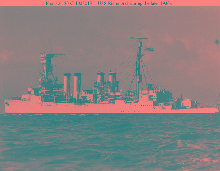 Američanům se stále nepodařilo vytvořit kýlovou linii, takže když v 8:40 poprvé zahřměly kanóny na japonských těžkých křižnících, pluly COGHLAN a BAILEY nalevo (a mírně vepředu) od RICHMONDU, zatímco DALE a MONAGHAN se držely napravo od vlajkové lodě, takže v úplavu RICHMONDU se na šedivých vlnách kolébal pouze SALT LAKE CITY. Palba vedená přibližně na vzdálenost 19 000 m se ukázala jako přesná, neboť jedna z prvních salv McMorrisovu vlajkovou loď zarámovala a způsobila lehké škody v prostoru mezi třetím a čtvrtým komínem.