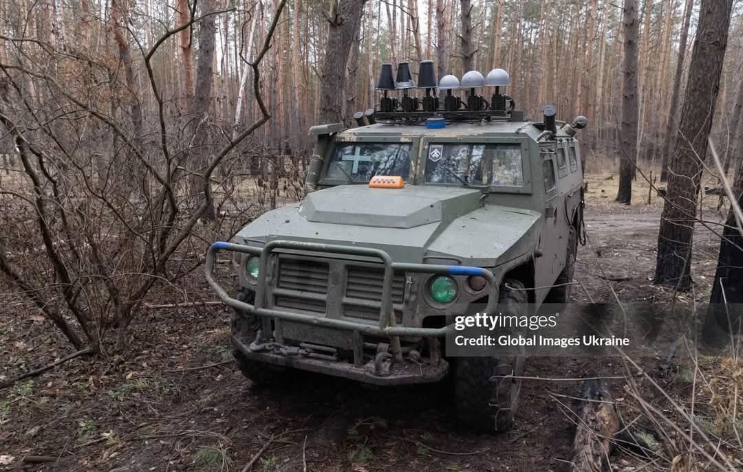 Foto: Ukořistěný velitelský Tigr s rušičkami dronů.