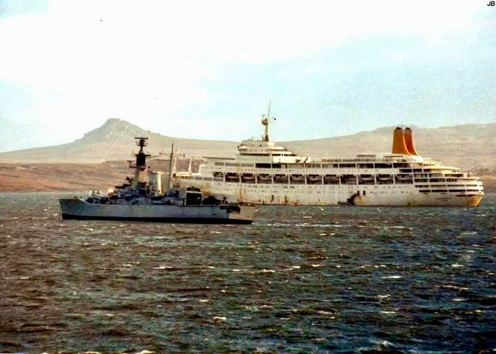 Ano. Vizuálně spíš pochcaná bílá velryba, ale budiž. Je to S/S Canberra u Falkland.