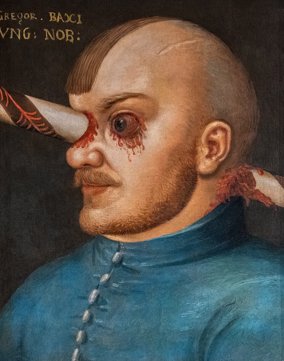 Uherský šlechtic Gregor Baci je známý jako muž s proraženou hlavou dřevcem. Portrét pochází od neznámého německého malíře, kolem roku 1550. Nutno podotknout, že muž není mrtvý, ale žil ještě rok po tomto zranění. Na úvod dodejme, že tento netradiční obraz uložil do své sbírky kuriozit arcivévoda Ferdinand II. Tyrolský a do dnešních dní je uložený na zámku Ambras v Innsbrucku. Jeho autor není znám a celkový formát je 39 × 31 cm. Jméno Gregor Baci je patrně zkomoleninou jména Gergely Paksy. Jednoznačně byl zasažen dřevcem do pravého očního důlku, projel lebkou a vystoupil až u krku. Vyboulené, nateklé a zakrvácené levé oko je důsledkem jevu zvaného Karotid-kavernózní sínusovitá píštěl (CCF), což je abnormální spojení mezi tepnou v krku a sítí žil v zadní části oka. Tyto žíly na zadní části oka přenášejí krev z tváře a mozku zpátky do srdce a nacházejí se v malých prostorách za očima nazývanými cavernous sinuses. Někdy se mezi těmito žilkami a jednou z vnitřních nebo vnějších krčních tepen, které se rozkládají po obou stranách krku, vytváří abnormální kanál. Takto vzniklým kanálem zvaným píštěl, může protékat krev. Rovněž dochází k tlaku na nervovou funkci která řídí pohyb oka. Tímto jevem se tedy přesně vysvětluje pro z druhé oka vytéklá krev, je vyboulené a dle rytiny (viz níže) se otáčí do nepřirozené pozice. CCF může být klasifikován jako přímý nebo nepřímý. Přímé se tvoří mezi částí vaší vnitřní krční tepny a žilkami uvnitř vašeho kavernózního sinusu. U tohoto typu píštěle je obvykle vysoký průtok krve. Tento typ je nejběžnější. Druhou možností (což je asi tento případ) je, že se tvoří mezi jeskyněmi svalových žil a větvemi karotidové arterie v membránách, které obklopují mozek. Míra průtoku krve v těchto píštělích je obvykle nízká. Není zcela jisté, jak tento šlechtic ke svému zranění přišel. Jeden zdroj tvrdí že pochází z turnaje, druhá zpráva z roku 1621 tvrdí, že jej husar utržil v boji s Turky. Zmiňuje se, že muž žil ještě celý rok a dobové tvrzení potvrzují i moderní lékaři. Dle obrazu by vyhotoven 3D model, z něhož je patrné, že dřevcem nebyl zasažen žádný životně důležitý orgán. Navíc jsou přikládány desinfekční účinky i samotné olověné barvě, jíž bylo dřevo pomalováno. Existuje ještě mědirytina z roku 1598, na níž je muž jmenován jako Marcus Baxam (Márk Baksa).